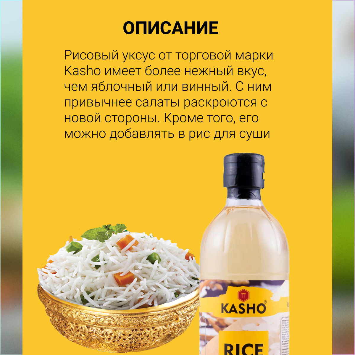 Kasho Уксус рисовый для приготовления суши роллов полностью готовая заправка для риса. Придает рису приятный кисло-сладкий вкус и особый аромат. Настаивается на водорослях комбу. Сбалансированная рецептура не требует никаких дополнительных ингредиентов: можно сразу заправлять рис для суши. С этой заправкой рис дольше не подсыхает.Условия храненияПри комнатной температуре, после вскрытия в холодильникеСоставуксус рисовый (уксус спиртовой, уксус рисовый, сахар, соль, краситель пищевой сахарный колер I простой), сахар, соль, экстракт водорослей «Конбу».Мы очень внимательно относимся к качеству товаров и всегда открыты к диалогу с покупателями. Пожалуйста, не стесняйтесь оставлять отзывы! Мы реагируем на каждый отзыв и обязательно дадим вам обратную связь.