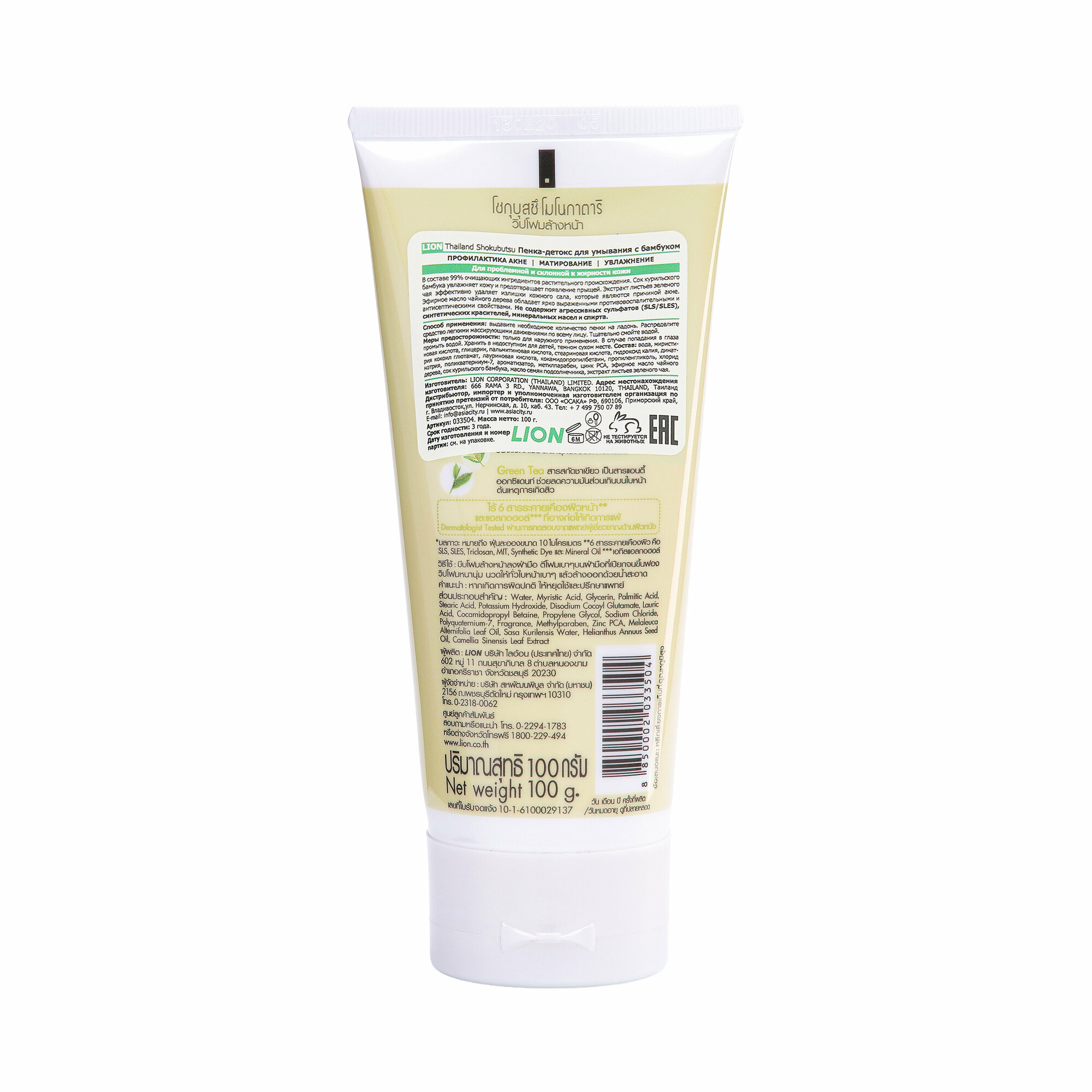 | Химический состав | Вода, миристиновая кислота, глицерин, пальмитиновая кислота, стеариновая кислота, гидроксид калия, динатрия кокоил глютамат, лауриновая кислота, кокамидопропилбетаин, пропиленгликоль, хлорид натрия, поликватерниум-7, ароматизатор, метилпарабен, цинк PCA, эфирное масло чайного дерева, сок курильского бамбука, масло семян подсолнечника, экстракт листьев зеленого чая |