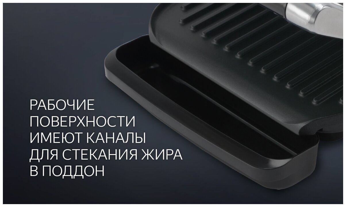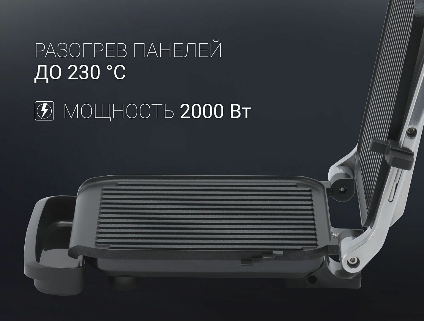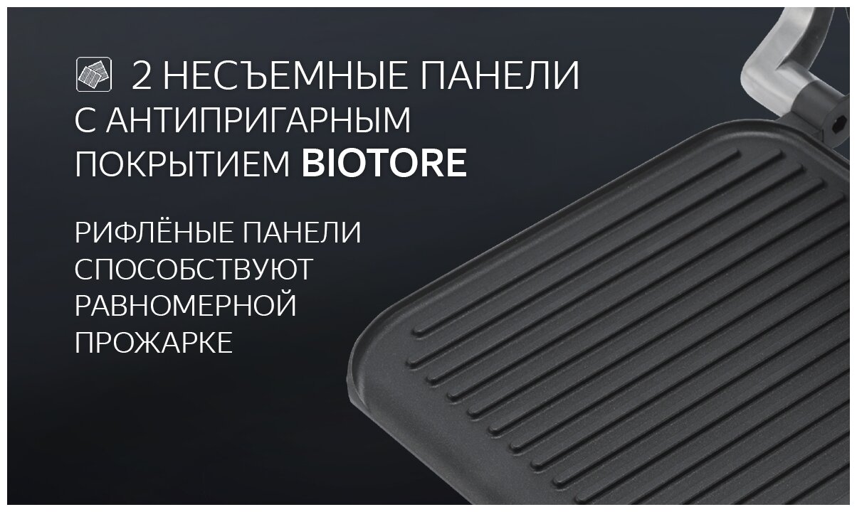 Плавная регулировка температуры. Вертикальное хранение. Мощность: 2000 Вт. 2 В 1 - РЕЖИМЫ "ГРИЛЬ" И "МИНИ-ПЕЧЬ". Разогрев панелей до 230?С. Размер панелей: 21х24 см. Регулировка высоты. 2 несъемные панели с антипригарным покрытием BIOTORE. Рифлёные панели способствуют равномерной прожарке. Рабочие поверхности имеют каналы для стекания жира в поддон. 2 индикатора работы. Поддон для жира. Специальная лопатка для легкой очистки.