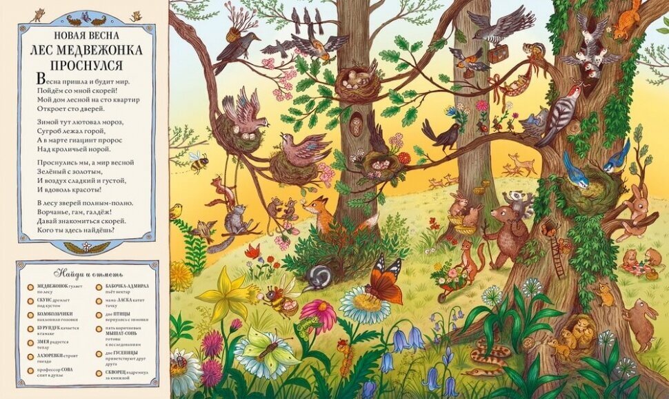 Подарочный виммельбух со стихами о лесе и его обитателях. Внутри 16 стихотворений в переводе Юлии Симбирской и около 100 заданий на развитие внимания.
