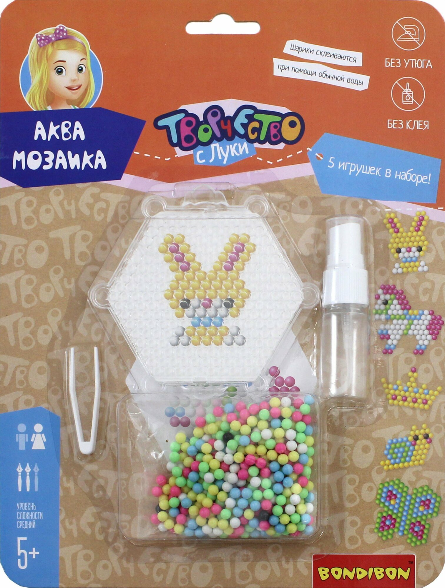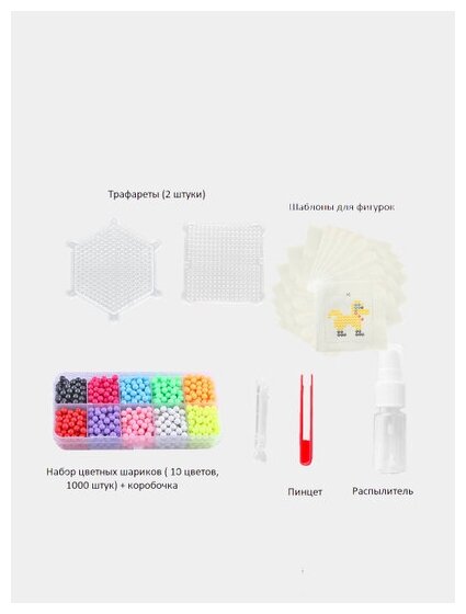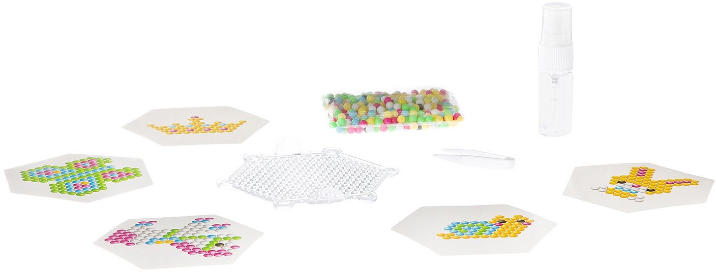 В наборе: 5 трафаретов, специальная подставка для шариков, пинцет, бутылочка с разбрызгивателем и цветные шарики.