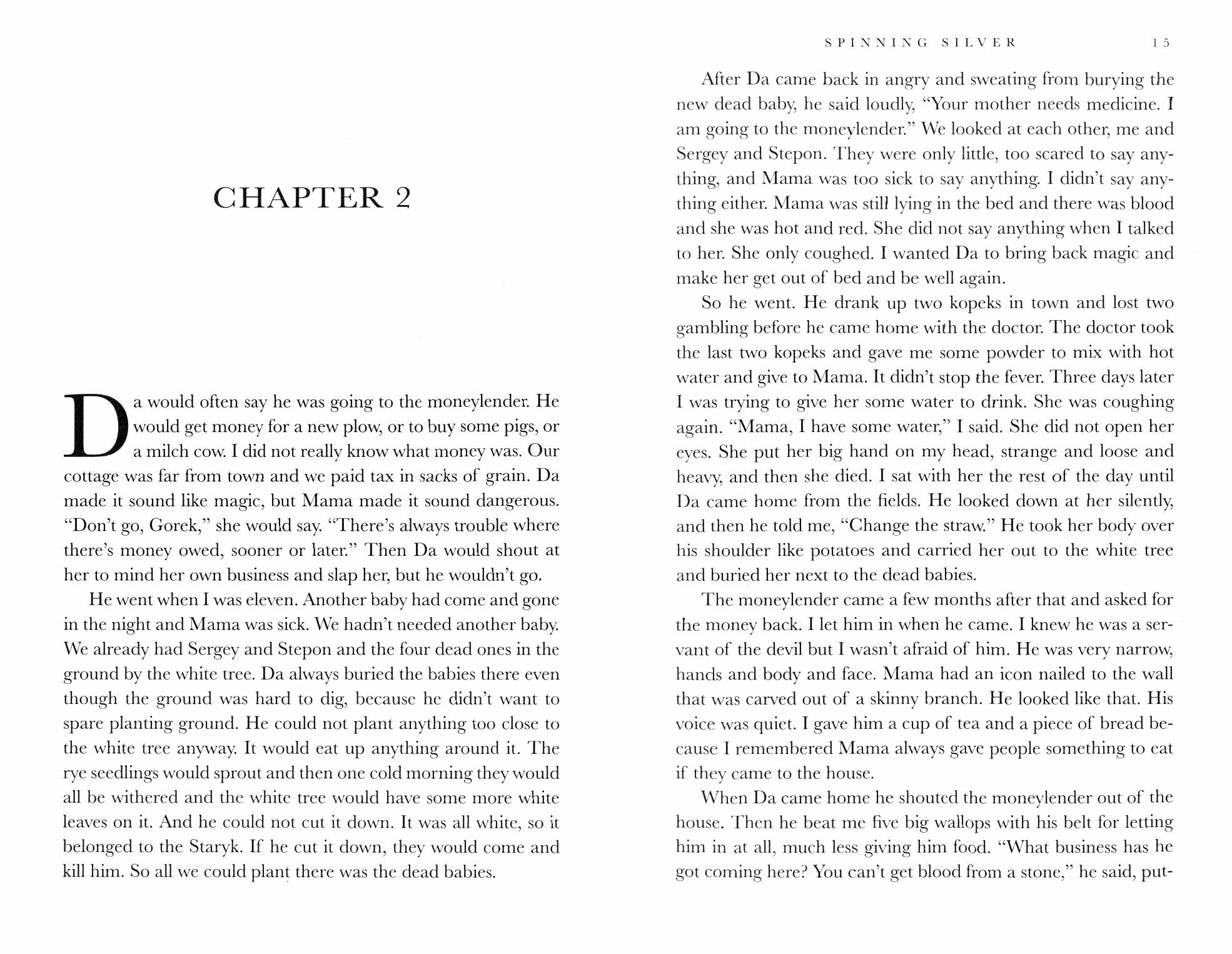 Miryem is the daughter and granddaughter of moneylenders, but her father's too kind-hearted to collect his debts. They face poverty, until Miryem hardens her own heart and takes up his work in their village. Her success creates rumours she can turn silver into gold, which attract the fairy king of winter himself. He sets her an impossible challenge - and if she fails, she'll die. Yet if she triumphs, it may mean a fate worse than death. And in her desperate efforts to succeed, Miryem unwittingly spins a web which draws in the unhappy daughter of a lord.