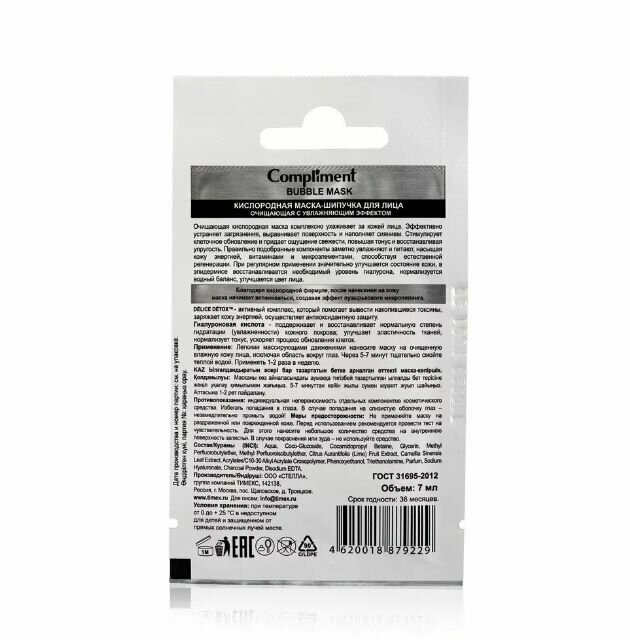 Очищающая кислородная маска Compliment Bubble Mask комплексно ухаживает за кожей лица. Эффективно устраняет загрязнения, выравнивает поверхность и наполняет сиянием. Стимулирует клеточное обновление и придает ощущение свежести, повышая тонус и восстанавливая упругость.