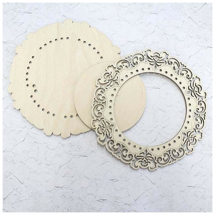 Рамка круглая средняя ажурная 28х29/18х18 Щепка ОР-032 Состав: три детали (фанера): деталь А (основание рамки), деталь В (основа для вышивки) и деталь С (верхняя накладная рамка).