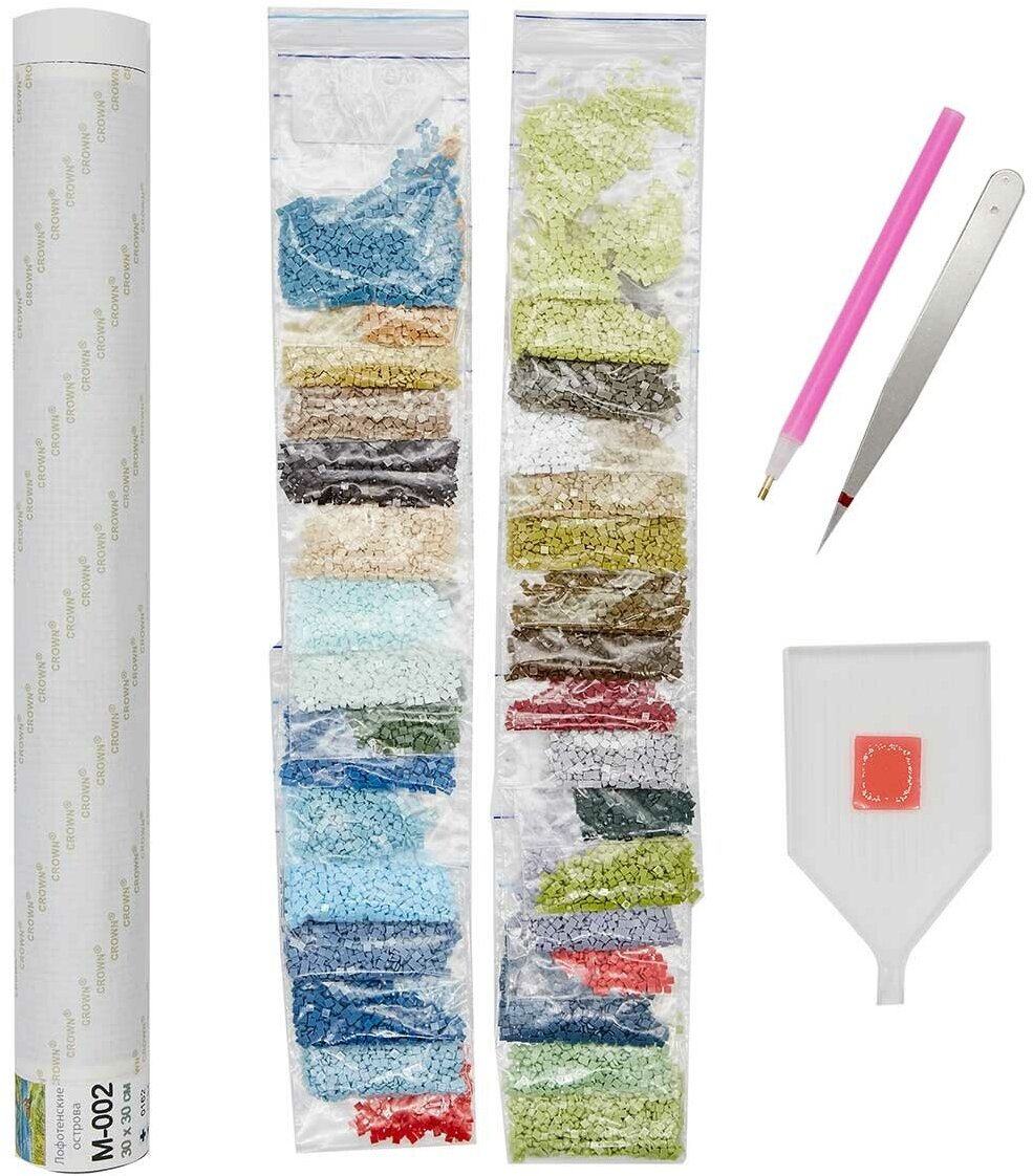 | Комплектация | холст с клеевым слоем и нанесенной схемой, квадратные стразы в пакетиках, стилус, пинцет, контейнер, силиконовая подушечка, инструкция. |