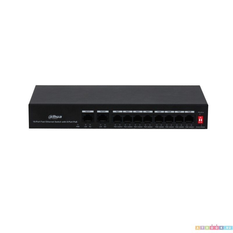 - 8 портов 10/100 Мбит/с с PoE, 2 порта uplink 10/100 Мбит/с