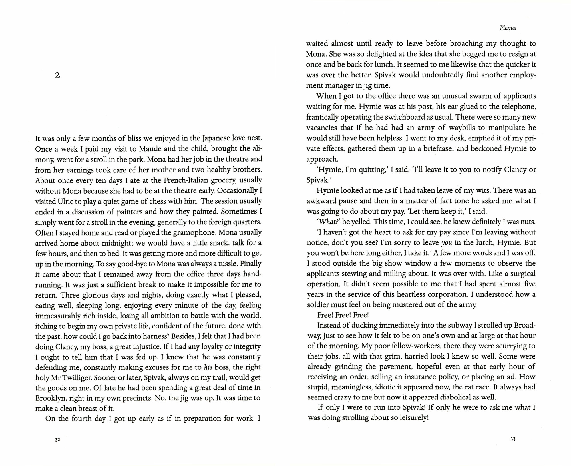 Plexus is the second volume of the scandalous trilogy The Rosy Crucifixion, Henry Miller's major life work Exploring one man's desperate desire for freedom, Plexus is the central volume of Henry Miller's scandalous semi-autobiographical trilogy The Rosy Crucifixion. It finds him in the midst of his stormy marriage to the volatile, duplicitous Mona, and joyfully quitting his dreary job for a hand-to-mouth existence in Brooklyn, as he takes his first steps towards becoming a writer.