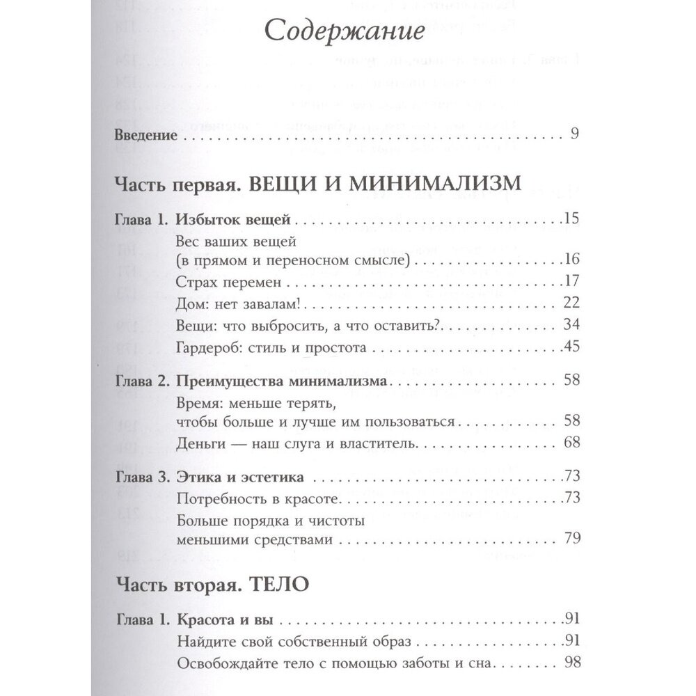 Книга интересна тем, что при своем небольшом объеме (чуть меньше 300 страниц) Лоро охватила практически все сферы жизни, призывая упростить их. В книге упоминается и о вещах, об окружении, о теле, о силе духа, о еде, о занятиях . Буквально обо всем по чуть-чуть.