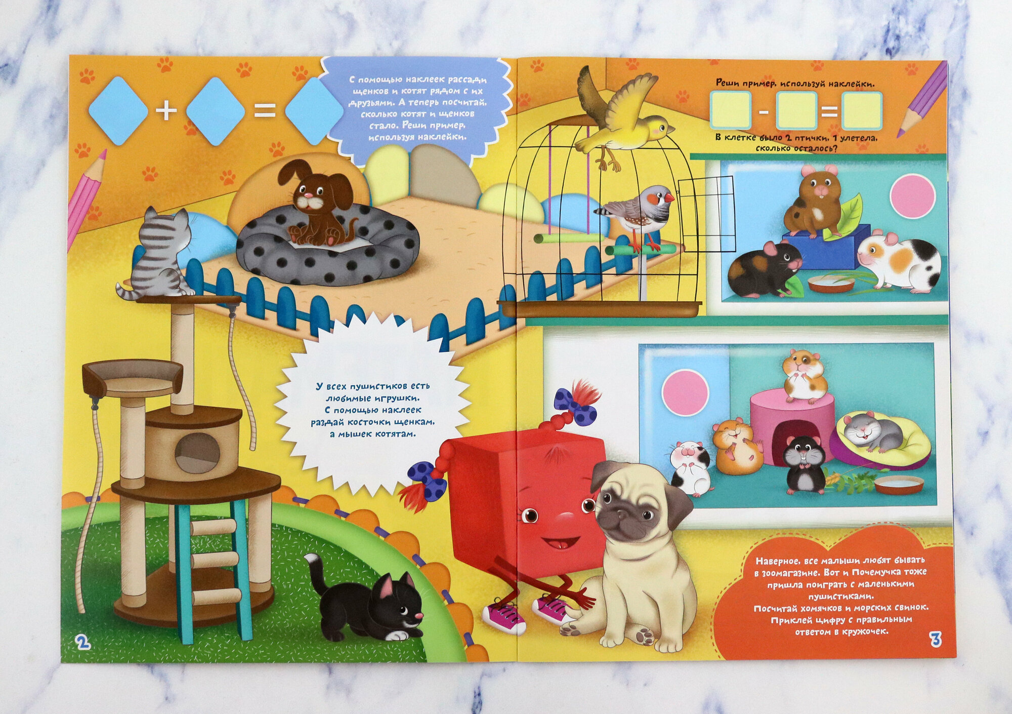 Школа почемучки поможет вашему малышу играя учить фигуры, учиться считать и дополнять странички наклейками.