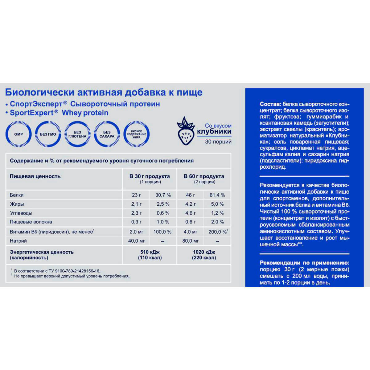| Состав | белка сывороточного концентрат; белка сывороточного изолят; фруктоза; гуммиарабик и ксантановая камедь (загустители); экстракт свеклы (краситель); ароматизатор натуральный "Клубника"; соль поваренная пищевая; сукралоза, цикламат натрия, ацесульфам калия и сахарин натрия (подсластители); пиридоксина гидрохлорид |