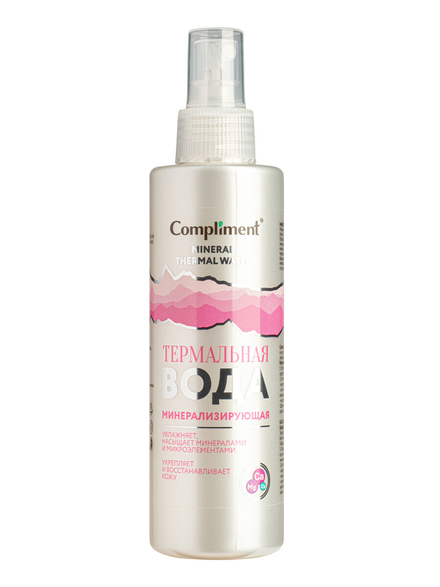 Рожденная в недрах вулкана, термальная вода Compliment богата высокой концентрацией минеральных элементов. Проходя через магматические породы, она насыщается уникальными минералами и микроэлементами, такими как магний, кальций, цинк и кремний. Минерализующая термальная вода восстанавливает и усиливает естественные барьерно-защитные функции кожи, помогает поддержать необходимый уровень увлажненности, помогает бороться со старением. Имеет нейтральный pH, не содержит отдушек.Рекомендации по применению:1. Утром или вечером после очищения и до нанесения средств ухода, а также для закрепления макияжа2. В течение дня во время / после прогулки в отапливаемом или кондиционируемом помещении во время / после загара или занятий спортом.*Допускается выпадение естественного осадка в связи с большой концентрацией минеральных солей.