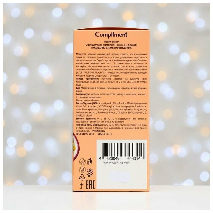 Сервис сравнения цен СкидкаГИД предлагает сравнить цены на товар «Скраб для тела Compliment Double Beauty с экстрактами маракуйи и лилавади 400мл»