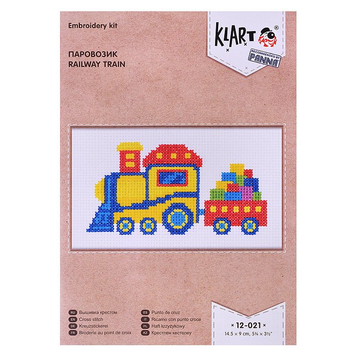 . Klart набор для вышивания 12-021 "Паровозик" В набор для вышивания Klart входят: канва Aida №14 Gamma, хлопчатобумажные нитки мулине Gamma, игла для вышивания Gamma, цветная схема, инструкция по вышиванию.