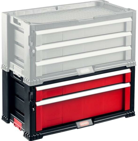 Модуль к комоду Keter 2 DRAWERS PLAS.SLIDE EuroPro - это модуль для инструментов с двумя ящиками. Модуль включает в себя глубокий ящик для больших инструментов. Меньший ящик подходит для более мелких деталей.