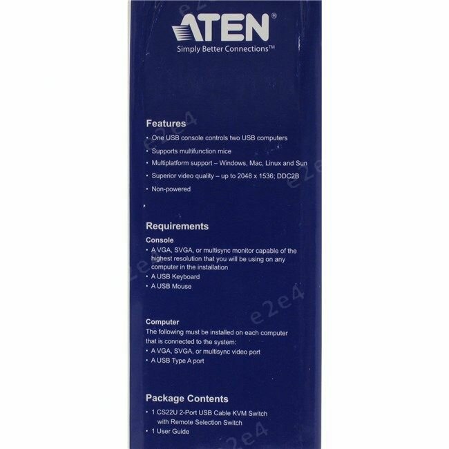 CS22U – 2 портовый кабельный USB KVM переключатель, KVM Switch CS22U-AT – KVM переключатель ATEN CS22U со шнуром USB, обеспечивающий простой и быстрый способ выбора компьютеров с помощью встроенного удаленного переключателя порта. Это позволяет установить устройство CS22U в недоступном месте, в то время как удаленный переключатель порта может быть удобно расположен на столе. Компактная конструкция устройства CS22U делает его идеальным решением для многоплатформенных настольных систем с приложениями, требующих видео высокого разрешения. [ /upload/rich_content/cs22u/CS22U_rich_content_Banner. jpg ] Компактный кабельный KVM-переключатель CS22U позволяет быстро переключаться между двумя ПК с интерфейсами VGA с помощью единой KVM-консоли, а также гибко совместно использовать носители информации, подключенные к ее USB-портам. Он поможет расширить рабочее пространство на столе, поддерживая его в чистоте и порядке, позволяя повысить производительность труда [ /upload/rich_content/cs22u/cs22u_rich_content_icon_02. jpg ] Беспроблемная интеграция разных платформ CS22U позволяет объединять управление различными компьютерными системами (Windows, Mac, Linux и Sun) с помощью одной KVM-консоли. [ /upload/rich_content/cs22u/cs22u_rich_content_03. jpg ] Гибкое совместное использование периферийных USB-устройств Консольные USB-порты могут использоваться для подключения в режиме plug-n-play к совместимым периферийным USB 2.0 устройствам для осуществления потребностей настольных компьютеров в интенсивной работе с данными. [ /upload/rich_content/cs22u/cs22u_rich_content_04. jpg ] Подсоедините и включайтесь в работу CS22U поддерживает горячее USB-подключение и получает питание по USB-шине от управляемых KVM-источников. [ /upload/rich_content/cs22u/cs22u_rich_content_05. jpg ] Применения [ /upload/rich_content/cs22u/cs22u_rich_content_06. jpg ] .
