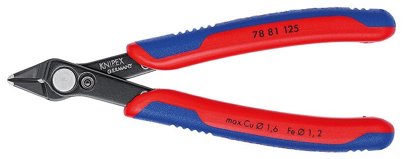 78 81 125 Electronic Super Knips® кусачки прецизионные для самых тонких работ по резанию, например, в электронике и точной механике. шлифованные, очень острые режущие кромки без фасок. Прецизионные кончики режут заподлицо проволоку диаметром от 0,2 мм. Рез с контролируемым смещением режущей кромки – для увеличениясрока службы и высокоточной резки самых тонких проводов. шарнир с заклепкой из легированной стали. исключительно легкий ход для работы с минимальным утомлением. с раскрывающей пружиной и ограничителем раскрытия. прецизионно шлифованные режущие кромки с очень маленькой фаской в т.ч. для твердой проволки. режущие кромки дополнительно закалены токами высокой частоты до твердости примерно 64 HRC. cталь инструментальная специальная, вороненая. - Параметры резания /проволока средней твёрдости (диаметр): Ø 1,2mm - Параметры резания / твёрдая проволока (диаметр): Ø 0,6mm - Параметры резания / мягкая проволока (диаметр): Ø 0,2 – 1,6mm - Длина губок (B): 9mm - Толщина губки (шарнир) (D