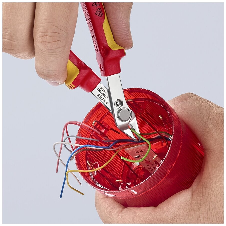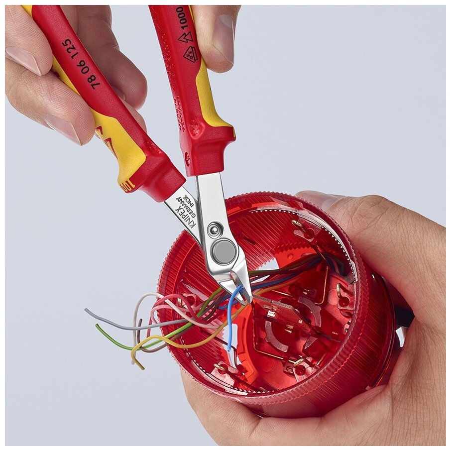 78 06 125 Electronic Super Knips® VDE Прецизионные кусачки для самого точного реза (например, в электронике и точной механике), соответствующие нормам VDE. Дополните свой комплект VDE инструментов. шлифованные, очень острые режущие кромки без фасок. Рез с контролируемым смещением режущей кромки – для увеличениясрока службы и высокоточной резки самых тонких проводов. Прецизионные кончики режут заподлицо проволоку диаметром от 0,2 мм. шарнир с заклепкой из легированной стали. исключительно легкий ход для работы с минимальным утомлением. с раскрывающей пружиной и ограничителем раскрытия. Твёрдость режущих кромок примерно 54 HRC. - Параметры резания /проволока средней твёрдости (диаметр): Ø 1,0mm - Параметры резания / мягкая проволока (диаметр): Ø 0,2 – 1,6mm - Длина губок (B): 9mm - Толщина губки (шарнир) (D): 7,5mm - Ширина головки (A): 13,5mm