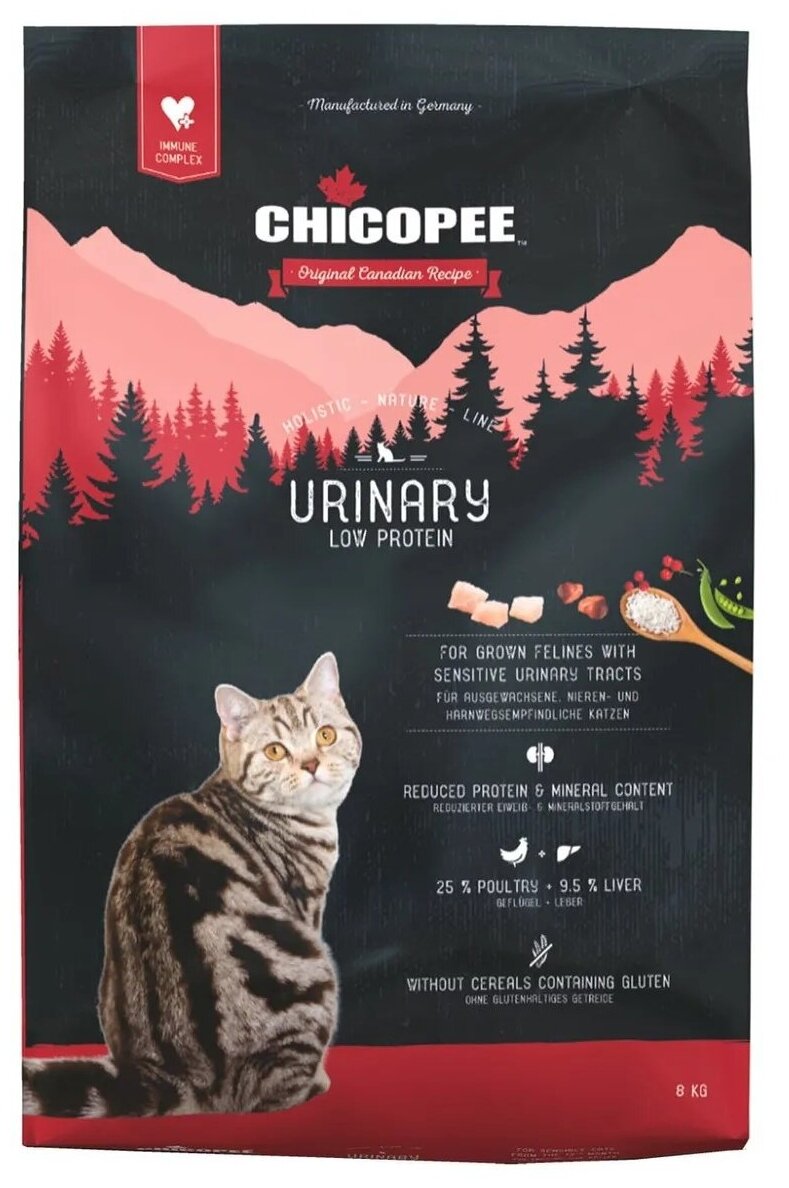 Chicopee HNL Cat Urinary сухой корм для кошек, склонных к проблемам с мочеполовой системой. Рацион подходит для всех взрослых животных, склонных к проблемам с мочеполовой системой. Пониженное содержание белка и минералов минимизирует нагрузку на почки и мочевыделительную систему кошки. Предотвращается образование камней в почках. В рационе содержатся только тщательно отобранные ингредиенты, полностью отсутствуют глютенсодержащие злаки (включая пшеницу). Это позволяет рекомендовать это питание и животным с чувствительным пищеварением. В формуле применяются легкоусвояемые источники углеводов (рис и горох). Добавление 9,5% печени улучшает вкусовые качества продукта.