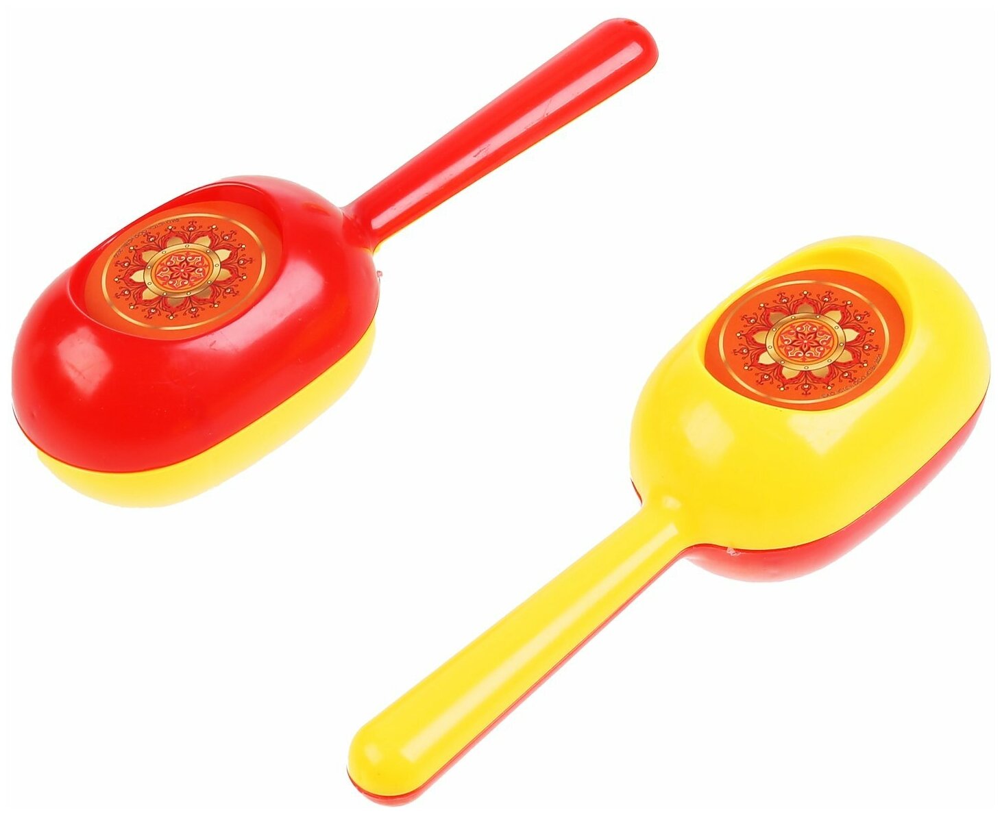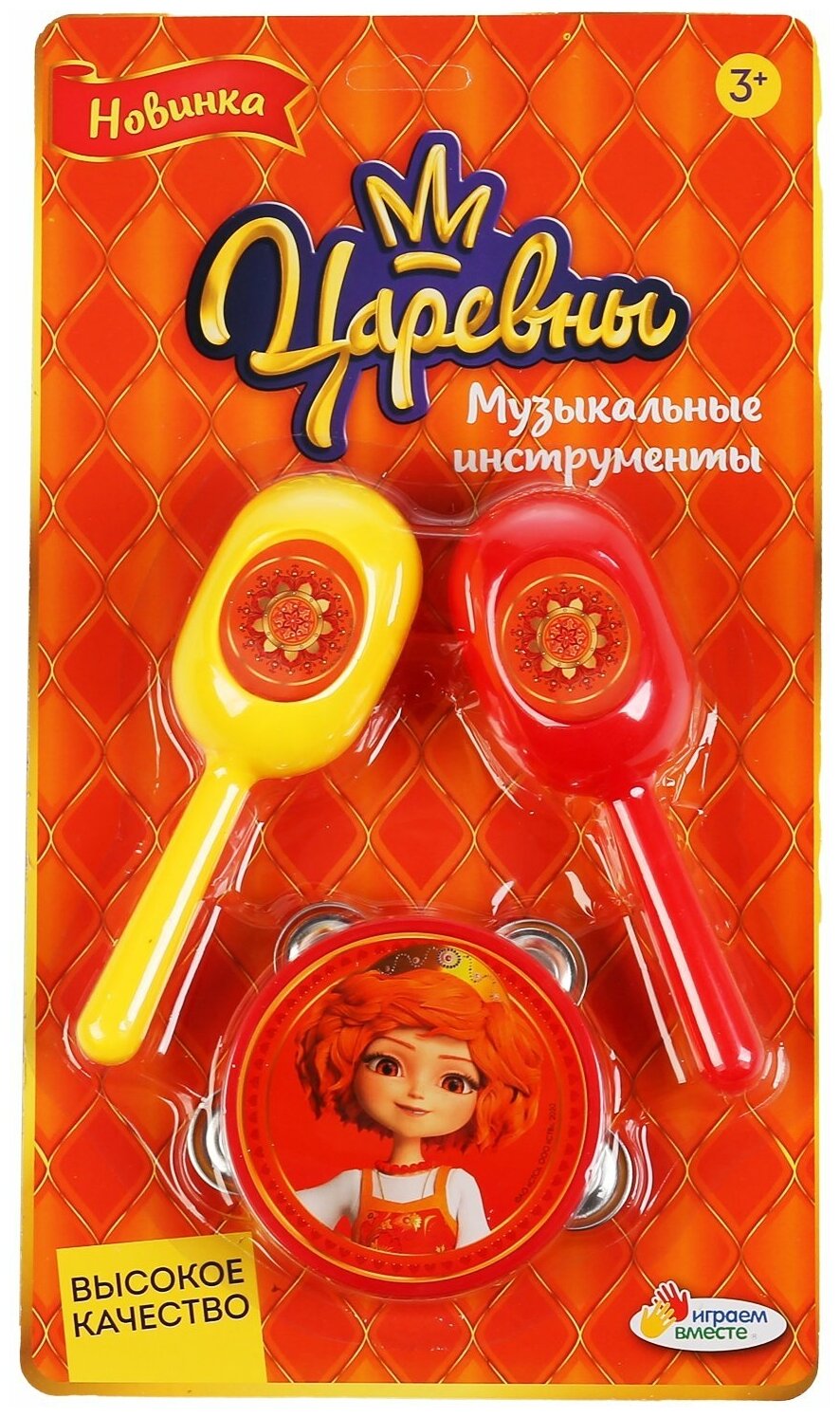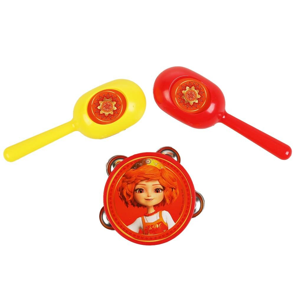 В набор входят два ярких маракаса, украшенные красивыми наклейками с причудливыми солнышками и узорами, а так же бубен с изображением царевны Варвары. оснащенный металлическими пластинами. С этим набором малыш освоит первые навыки игры на музыкальных инструментах и получит массу приятных впечатлений.