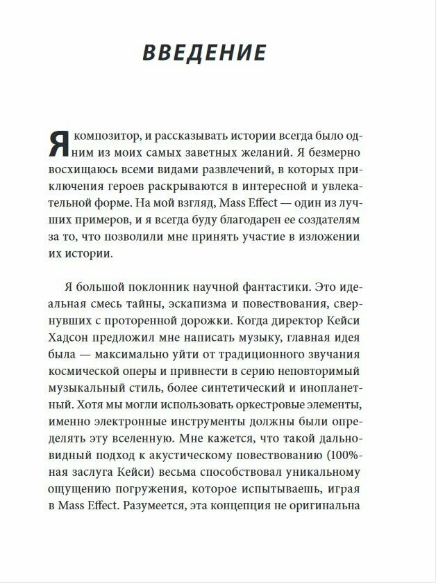 Большая часть книги посвящена рассказу о первоначальных идеях создания мира Mass Effect, о возникновении вселенной, создании космической атмосферы за счёт эффектов и музыкального сопровождения, проработке персонажей, их историй и, конечно, возникновения знаменитого имени капитана, о неожиданных последствиях выбора в игровом процессе, о которых вы, возможно, и не догадывались.