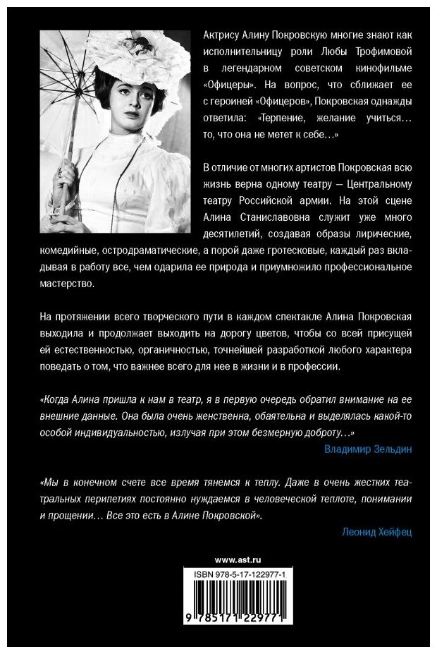 Книга очень эмоциональная и это её достоинство.Ведь, как замечал Александр Володин, "театр и кино - искусства, скорее эмоциональные, нежели интеллектуальные". Но, к сожалению, в книге столько ошибок! И в тексте, и в подписях к фотографиям. И в этом, наверное, вина редактора. Автор может ошибиться, а редактор на то и редактор, чтобы всё проверить, исправить.Всё-таки мы, читатели, платим за книги немалые деньги. И хотим, чтобы в ней все было безупречно. Да и актриса Алина Покровская достойна качественной монографии.