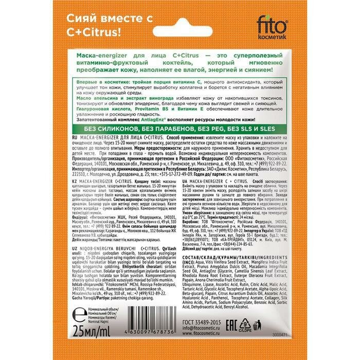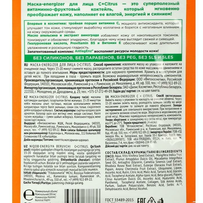 Сервис сравнения цен СкидкаГИД предлагает сравнить цены на товар «Маска-energizer для лица тканевая c+citrus серии beauty visage fito косметик 25 мл Фитокосметик ООО (503990)»
