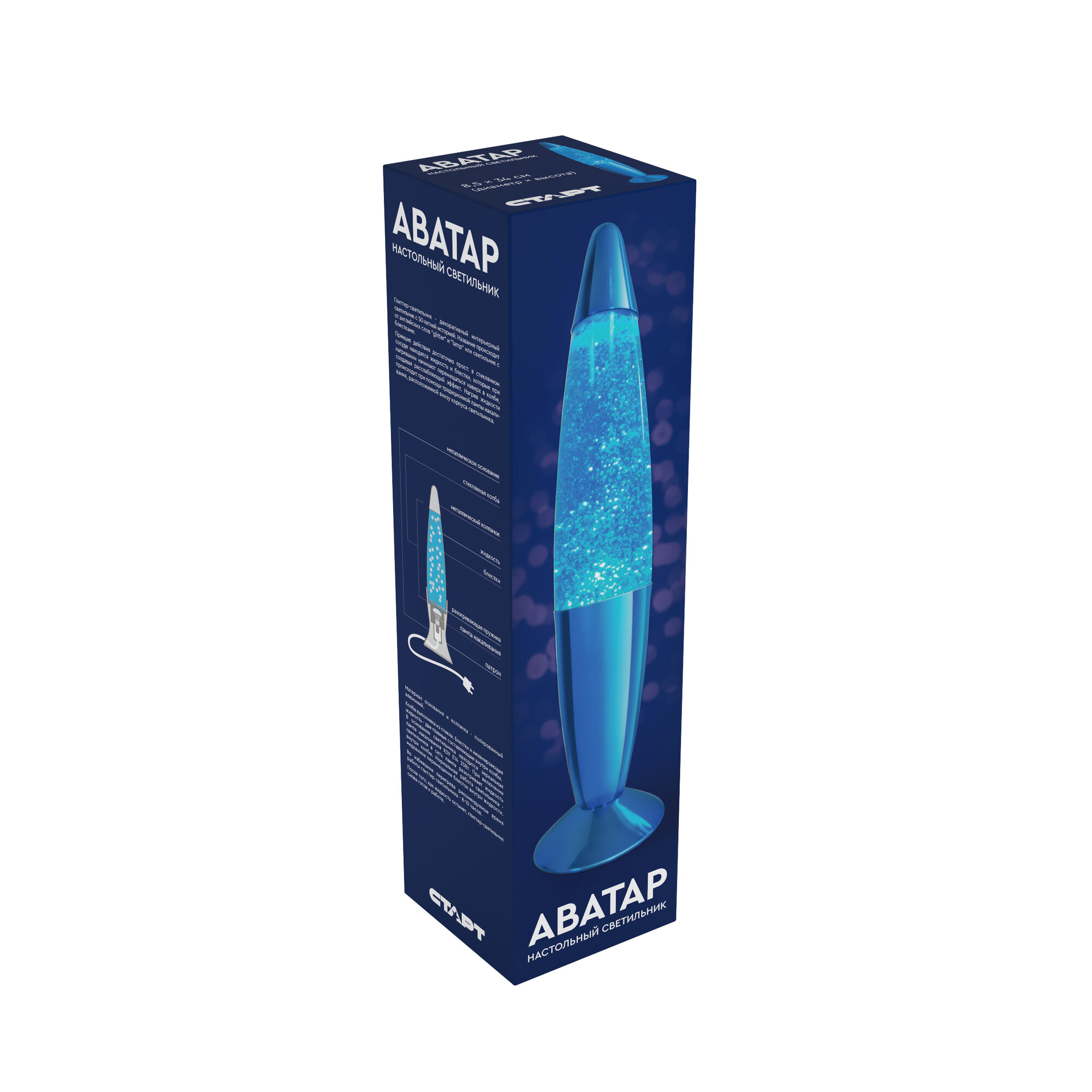 Декоративный светильник Аватар синий – одна из самых впечатляющих моделей ночников от компании СТАРТ. В жидкости, заполняющей полупрозрачный корпус устройства, перемещаются разноцветные блёстки. По форме глиттер светильник (от англ. «glitter» – «блестеть», «сверкать») напоминает шариковую ручку, если её поставить вертикально. Корпус длинный, обтекаемый и заостряется с обеих сторон. Первое «остриё» уходит в паз небольшой округлой подставки, а на второе, совсем как у ручки, навинчен колпачок. Колба светильника наполнена специальной незамерзающей жидкостью с мелкими блёстками из органических и неорганических соединений. В неработающем светильнике глиттеры собраны на дне колбы и начинают подниматься вверх, когда ночник включен. Всё более быстрое перемещение разноцветных блёсток в светящемся стекле создаёт потрясающий визуальный эффект. Декоративный светильник СТАРТ АВАТАР – сам по себе великолепный предмет декора – прекрасно впишется в дизайн вашей квартиры.