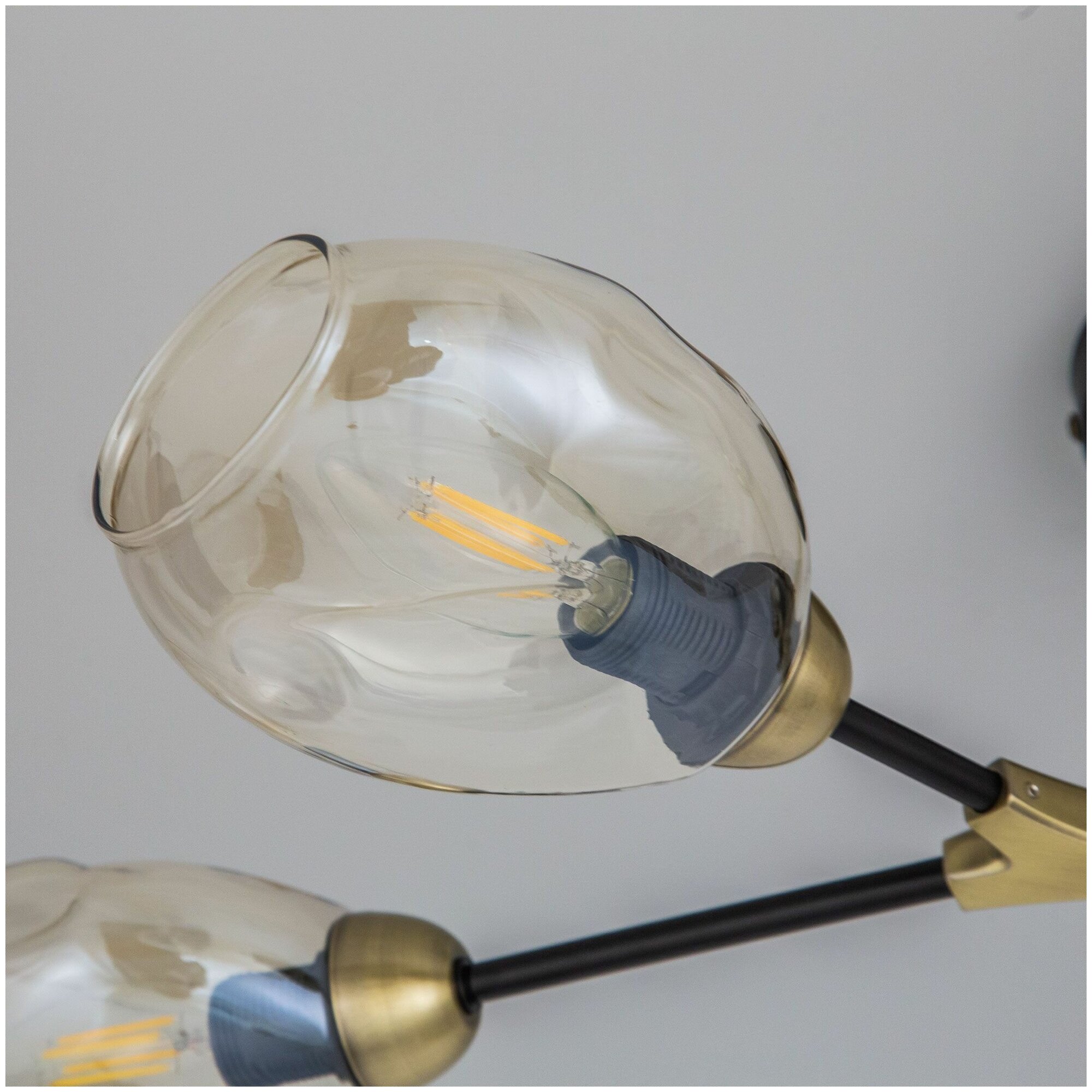 По дизайну люстра Монтана тяготеет к стилю модерн, но столь же эффектно будет смотреться в лофт-студии. Плафоны расположены в горизонтальной плоскости и направлены в разные стороны, что позволяет осветить все пространство комнаты. Небольшие углубления в поверхности стеклянных рассеивателей придают им оригинальную, слегка уплощенную форму. Черные металлические рожки собраны попарно и зафиксированы соединительным элементом, который, так же, как штанга и держатели патронов, гальванизирован в оттенок бронзы.
