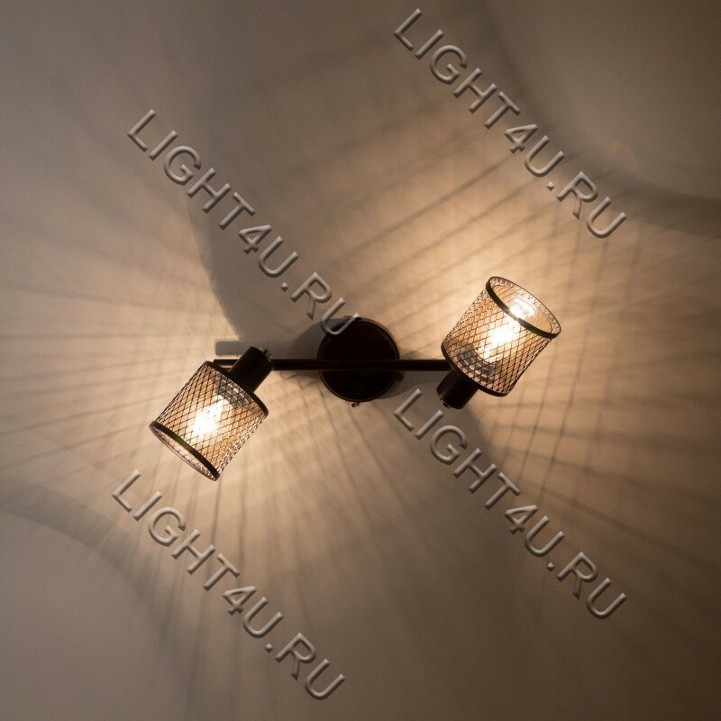 Настенно-потолочный светильник Робин – удачное решение, если в комнате необходимо дополнительное направленное освещение. Поворотный спот имеет важное преимущество: плафоны можно нацелить в одну или противоположные стороны, усиливая суммарный световой поток либо охватывая большую площадь. Стеклянные рассеиватели заключены в выполняющий защитную и декоративную функции каркас из металлической сетки с ромбовидными ячейками, что делает модель органичной как в лофте, так и в модерновом интерьере.