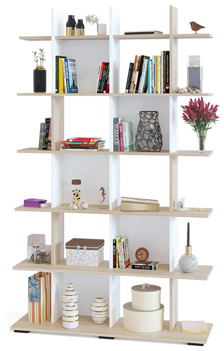 Художественное описание товара: Эргономичный и привлекательный стеллаж СТ-6 станет практичным дополнением домашней обстановки или офисного помещения. Изделие выполнено в современном стиле, благодаря чему сможет выгодно дополнить собой практически любой интерьер. Для изготовления стеллажа используется ЛДСП толщиной 16 мм. Края модели обработаны кромкой ПВХ 2 и 0,4 мм, это повысит уровень износостойкости и продлит срок службы конструкции. Наполнение стеллажа состоит из множества открытых полочек. На них можно с удобством разместить книги, журналы, косметические средства и различные предметы декора. Пять полок оснащены задней стенкой, что обеспечит более безопасное хранение предметов и убережет их от падения.,