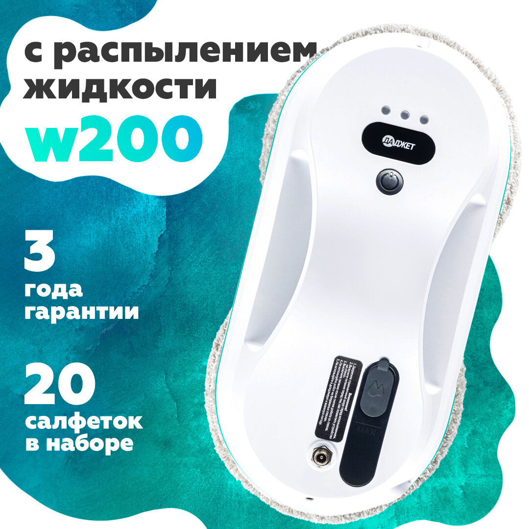 | Комплект поставки | Робот-мойщик окон Даджет W200; Руководство пользователя; Блок питания с кабелем; Пульт управления; Емкость для моющего средства; Батарейки для пульта управления (2 шт); Комплект салфеток (20 шт); Дополнительные кольца для салфеток (2 шт); Страховочный трос с карабином |