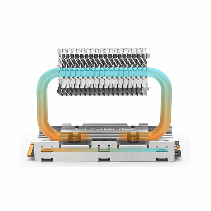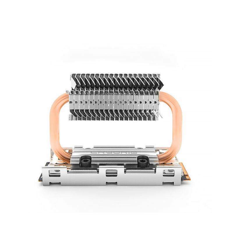 Frostbit - это пассивный радиатор для высокопроизводительных твердотельных (SSD) накопителей в формате М.2. Модель наделена двумя тепловыми трубками. Конструкция включает ультратонкую 1-миллиметровую тепловую трубку, располагающуюся в области радиатора в основании. Вторая тепловая трубка имеет диаметр 6 мм: она соединена с довольно крупным радиатором цилиндрической формы. Модуль с 6-миллиметровой тепловой трубкой и цилиндрическим радиатором может отклоняться в сторону, благодаря чему охладитель не будет мешать другим компонентам в ПК. Радиатор обеспечивает эффективный отвод тепла от накопителя М.2, что способствует повышению стабильности его работы. Решение рассчитано прежде всего на мощные игровые компьютеры и системы для энтузиастов.