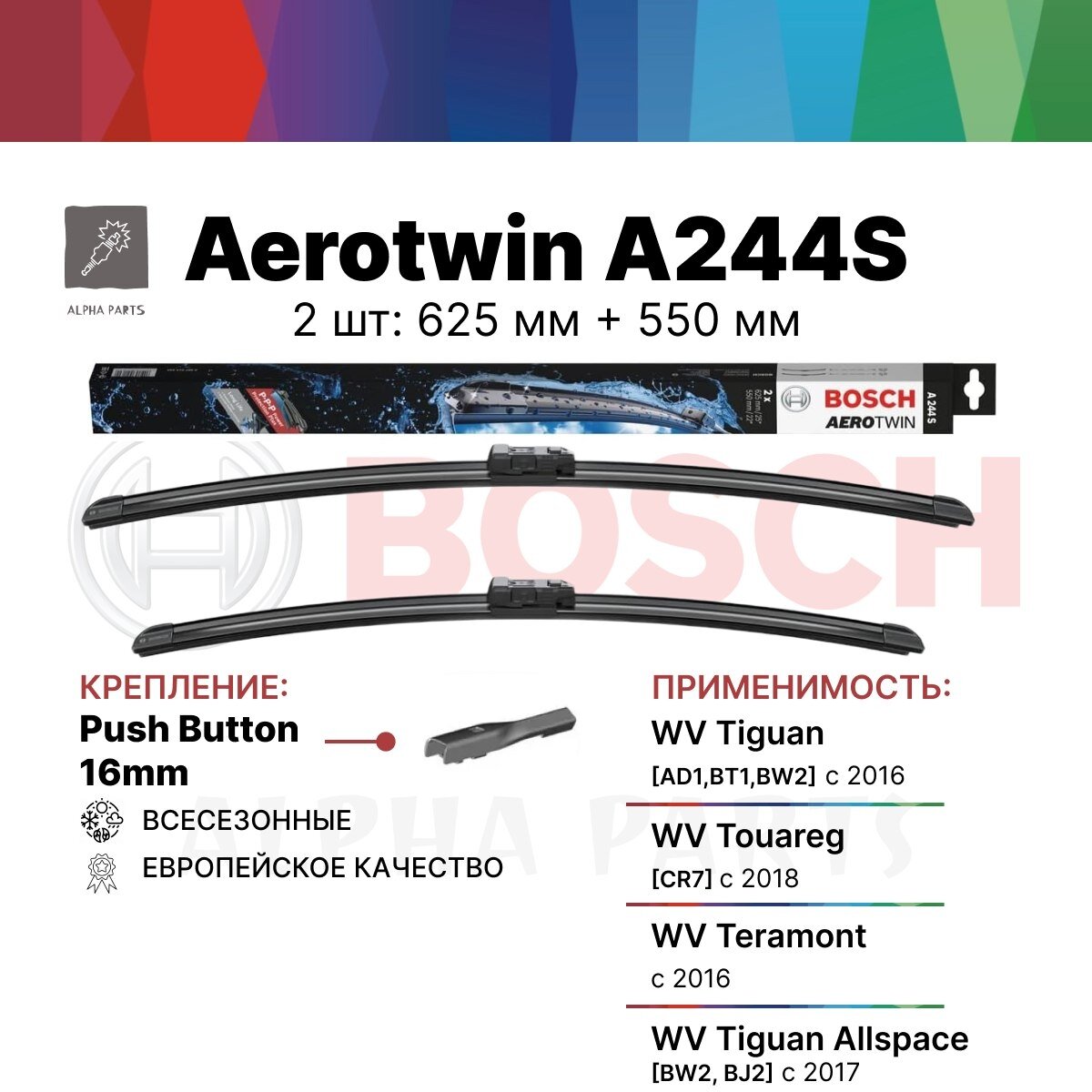 Щетки с/о BOSCH 3397014244 /A244S/ 630/550 мм Push Button 16mm VW Tiguan (AD1/BT1) `16-Bosch Aerotwin A244S это набор из 2-х щеток с длинами 625мм и 550мм. Дворники имеют бескаркасную конструкцию.Серия Bosch Aerotwin - топовая серия от уважаемого немецкого производителя Bosch. Стеклоочистители этой серии имеют продвинутую бескаркасную конструкцию и поставляются на заводы европейских автопроизводителей. Резинка дворника производится из многокомпонентной резины, превосходящей по параметрам натуральный каучук. Пружинящие элементы выполнены из специальной стали и сохраняют первоначальную упругость в течение всего времени эксплуатации стеклоочистителей. Bosch Aerotwin – всесезонные дворники.Дворники устанавливается на крепления нескольких типов: Узкий Push Button 16mm. В отличии от стеклоочистителей с одним вариантом крепления, эти щетки немного сложнее в установке. Пожалуйста, ознакомьтесь с инструкцией.Щетки Bosch Aerotwin A244S имеют асимметричный спойлер, который обеспечивает наилучший прижим дворников на высокой скорости. Однако, щетки с асимметричным спойлером менее универсальны, чем с симметричным спойлером.Данные щетки не предназначены для установки на автомобили с правым рулем и установки на автомобили с распашной (оппозитной) системой стеклоочистителя!