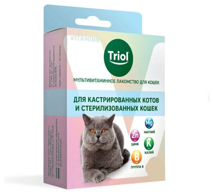 Мультивитаминное лакомство TRIOL разработано с учетом основных проблем кастрированных котов и стерилизованных кошек. Пивные дрожжи в составе - источник витаминов, в частности всей группы В, что позволяет устранить авитаминоз после приема антибиотиков и укрепить иммунитет питомца. Также пивные дрожжи богаты минералами (фосфор, калий, медь, цинк, натрий, магний, селен, сера) и содержат 18 аминокислот, что в комплексе с таурином и биотином способствует снижению риска развития мочекаменной болезни, нормализует микрофлору кишечника.