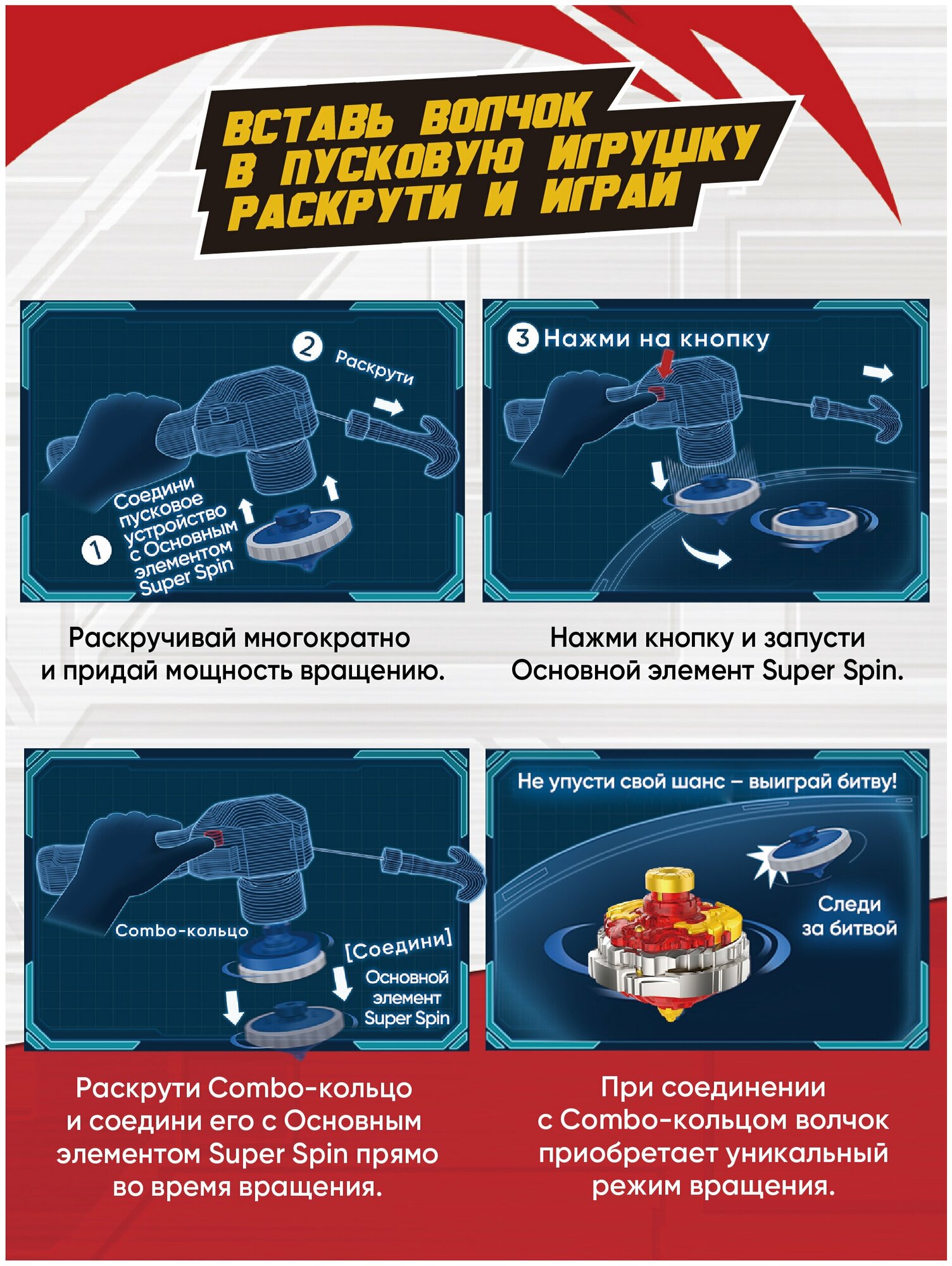 | Состав набора | 2 Combo-кольца, 1 Основной элемент Super Spin, 1 Пусковое устройство, 1 инструкция |