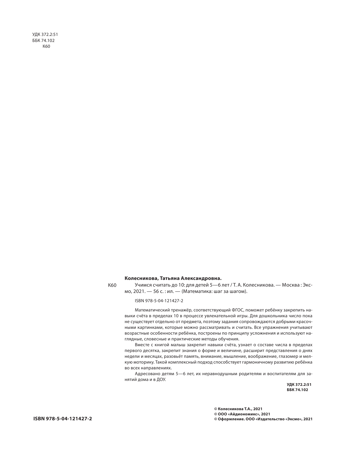 Сервис сравнения цен СкидкаГИД предлагает сравнить цены на товар «Книга: Учимся считать до 10: для детей 5-6 лет (Колесникова Татьяна Александровна, Колесникова О. (соавтор)); Эксмодетство, 2021»