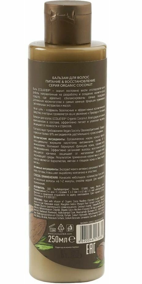 Бальзам для волос ECOLATIER® Organic Coconut, благодаря активным компонентам в составе, эффективно питает и уплотняет волосы, защищает от ломкости и стрессов. Соответствует требованиям Vegan Society (Великобритания). Продукт содержит 97% ингредиентов натурального происхождения. Органические ингредиенты: Органическое масло кокоса – ценный косметический компонент, богато насыщенными жирными кислотами, витаминами группы В и минералами. Усиливает барьерную функцию кожи, препятствует обезвоживанию. Эффективно увлажняет волосы, восстанавливает секущиеся кончики, защищает от негативных воздействий окружающей среды. Результатом применения косметики с маслом кокоса является бархатистая, мягкая и гладкая кожа и блестящие волосы. Активные ингредиенты: Экстракт манго активно увлажняет волосы и кожу головы, повышает выработку коллагена и эластина.