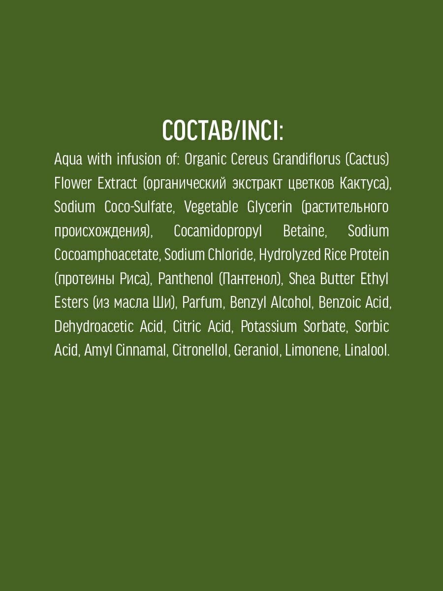 | Химический состав | aqua with infusion of: organic cereus grandiflorus (cactus) flower extract (органический экстракт цветков кактуса), sodium coco-sulfate, vegetable glycerin (растительного происхождения), cocamidopropyl betaine, sodium cocoamphoacetate, sodium chloride, hydrolyzed rice protein (протеины риса), panthenol (пантенол), shea butter ethyl esters (из масла ши), parfum, benzyl alcohol, benzoic acid, dehydroacetic acid, citric acid, potassium sorbate, sorbic acid, amyl cinnamal, citronellol, geraniol, limonene, linalool |