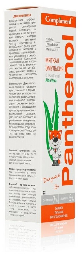 Для увлажнения, насыщения питательными веществами и восстановления чувствительной кожи ребенка вследствие полученных ожогов, что сопровождаются жжением и болевыми ощущениями, косметической компанией "Тимекс" была разработана мягкая эмульсия для детей мгновенного действия при ожогах Compliment panthenol. Продукция этого производителя косметики уже много лет пользуется заслуженным спросом на рынке, так как прочно ассоциируется у потребителей со стабильным качеством, высокой эффективностью и выгодной ценой. Для изготовления своих продуктов компания использует только сырье проверенных европейских марок, современные и экологически безопасные рецептуры, которые отличаются гарантированным действием и способны удовлетворить запросы самых требовательных покупателей. Эта мягкая эмульсия была создана специалистами косметической марки для увлажнения, насыщения необходимыми питательными веществами и восстановления чувствительной кожи ребенка в возрасти от 3-х лет. Ее рекомендуется использовать в случае полученных термических или солнечных ожогов, которые сопровождаются жжением, болевыми ощущениями и нарушением естественного гидробаланса кожи. В качестве основного компонента для этой эмульсии используется декспантенол (D-пантенол), высокое содержание которого способствует интенсивному увлажнению поврежденных участков кожного покрова, восстановлению их на клеточном уровне и устранению проблемы обезвоженности.