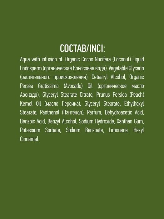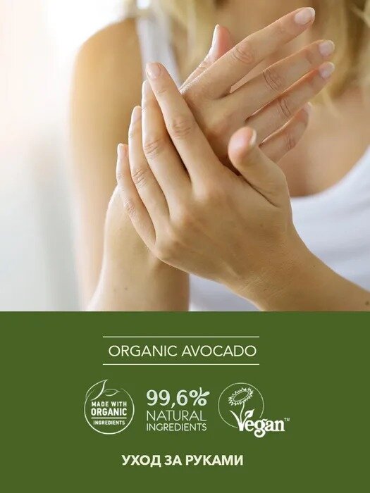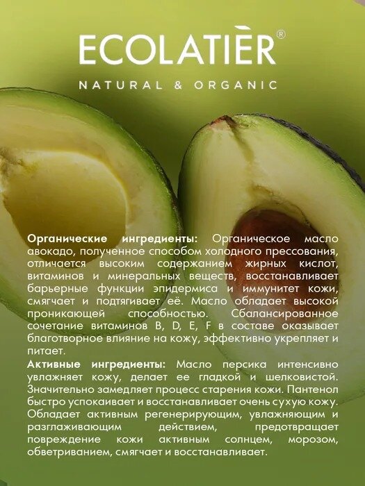 Органические ингредиенты: Органическое масло авокадо, полученное способом холодного прессования, отличается высоким содержанием жирных кислот, витаминов и минеральных веществ, восстанавливает барьерные функции эпидермиса и иммунитет кожи, смягчает и подтягивает её. Масло обладает высокой проникающей способностью. Сбалансированное сочетание витаминов B, D, E, F в составе оказывает благотворное влияние на кожу, эффективно укрепляет и питает. Предохраняет от негативного воздействия ультрафиолетовых лучей.