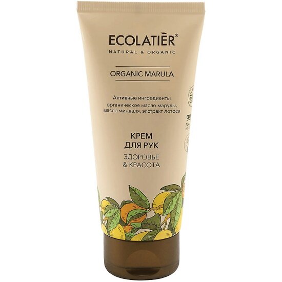 Крем для рук ECOLATIER® Organic Marula с натуральными питательными ингредиентами прекрасно увлажняет и восстанавливает кожу. Защищает от воздействия неблагоприятных факторов: солнца, ветра, высоких и низких температур. Нормализует уровень влаги в клетках кожи, питает и смягчает кожу рук и кутикулу.Соответствует требованиям Vegan Society (Великобритания). Продукт содержит более 99% ингредиентов растительного происхождения.Органические ингредиенты: Органическое масло марулы получают из спелых плодов методом холодного отжима. Высокое содержание жирных кислот и микроэлементов обеспечивает глубокий уровень увлажненности кожи. Благодаря витаминам С и Е, масло марулы проявляет антиоксидантную активность и защищает кожу от преждевременного старения. Быстро впитывается, проникает глубоко в слои кожи, стимулирует обменные процессы и восстановление клеток, эффективно укрепляет соединительную ткань. Делает кожу нежной и гладкой.Активные ингредиенты:Масло миндаля замечательно увлажняет и глубоко насыщает кожу полезными веществами и витаминами. Смягчает, восстанавливает природную эластичность и упругость.Экстракт лотоса глубоко питает кожу, активно увлажняет, повышает выработку коллагена и эластина.