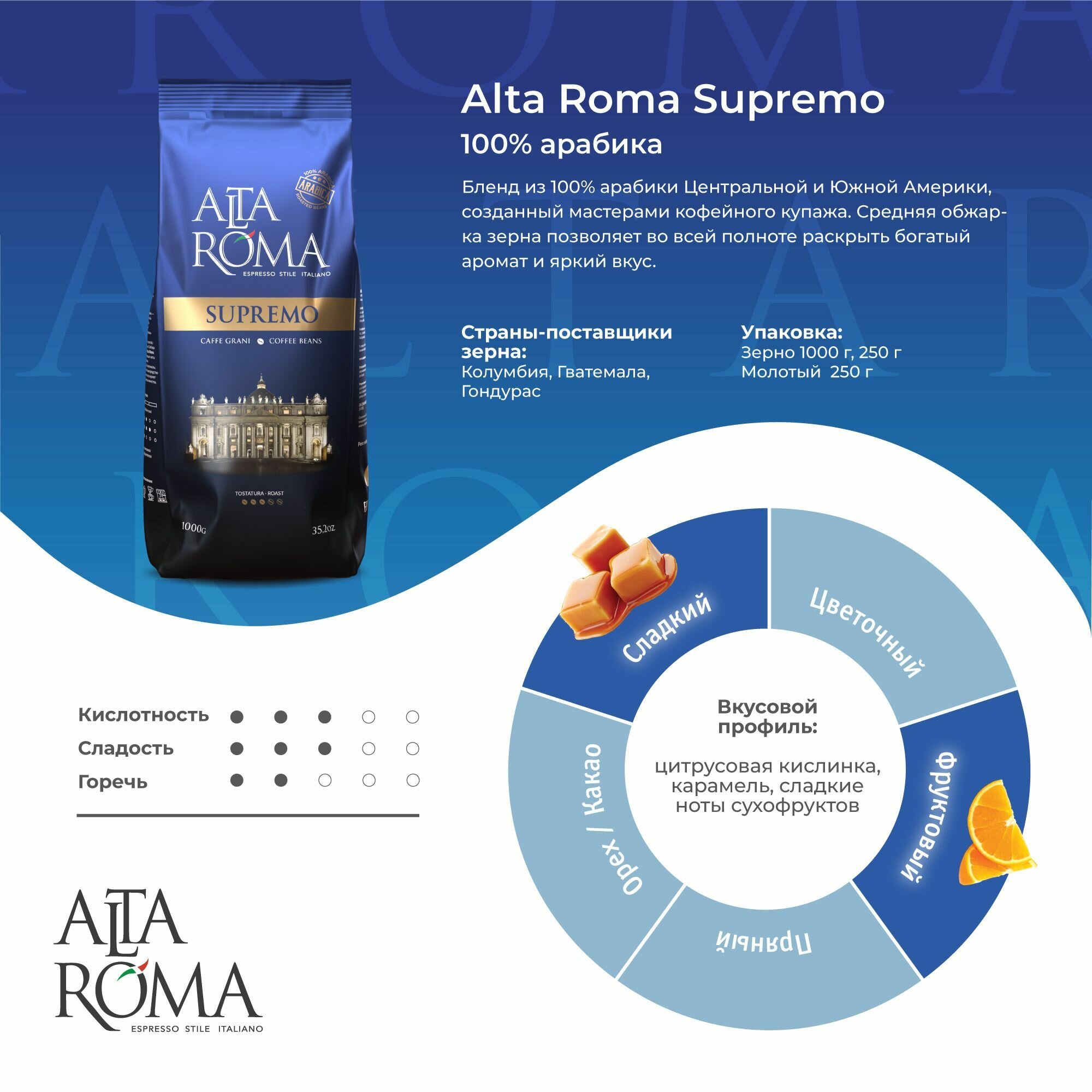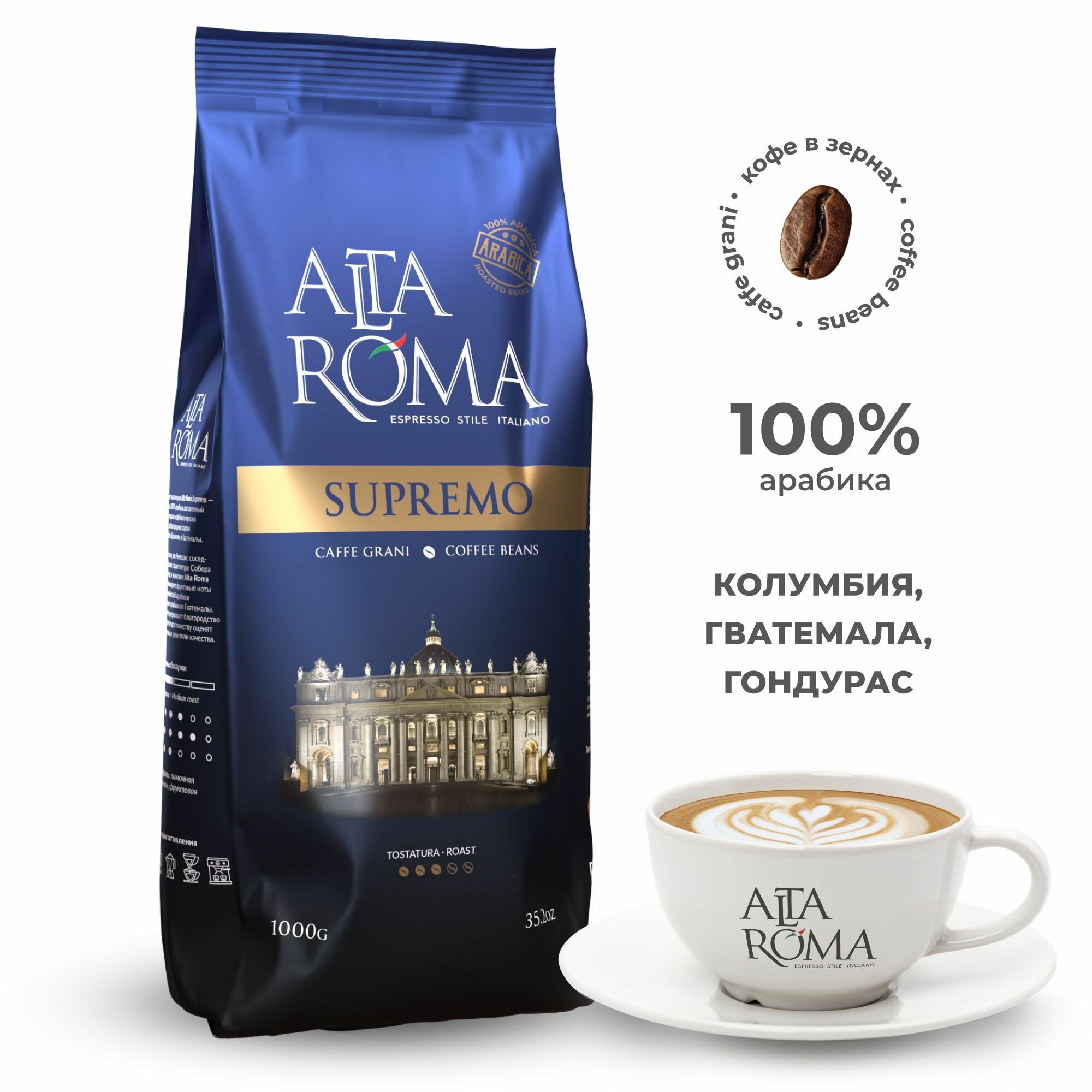 Кофе в зернах Alta Roma Supremo - это прекрасный бленд, созданный из премиальных сортов арабики, собранной с плантаций Бразилии, Колумбии и Гватемалы. Кофейные зерна бережно обжариваются, что позволяет сохранить ценные и ароматные эфирные масла, даря кофейному напитку великолепный вкус и аромат. Свежеприготовленная чашка кофе очарует тонким ароматом пряностей и нежным вкусом с нотками шоколада. Кофе Alta Roma Supremo производится на современном итальянском оборудовании с использованием итальянской рецептуры, специалистами, которые прошли обучение на фабрике в Италии, перенимая их опыт и мастерство в создании качественного и изысканного напитка. Более 20 лет кофейные мастера оттачивают свои навыки, даря поклонникам бодрящего кофе продукт европейского качества с достойными характеристиками. Несколько блендов, в числе которых Alta Roma Supremo, подарили компании золотую медаль в номинации Лучший продукт 2018 на выставке Продэкспо-2018 за высокое качество, что еще раз подтверждает стремление к достижению высоких целей и созданию безукоризненной продукции.
