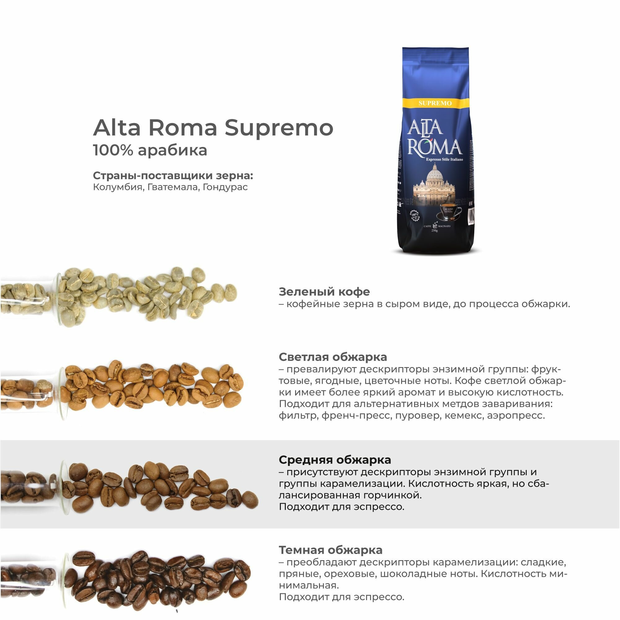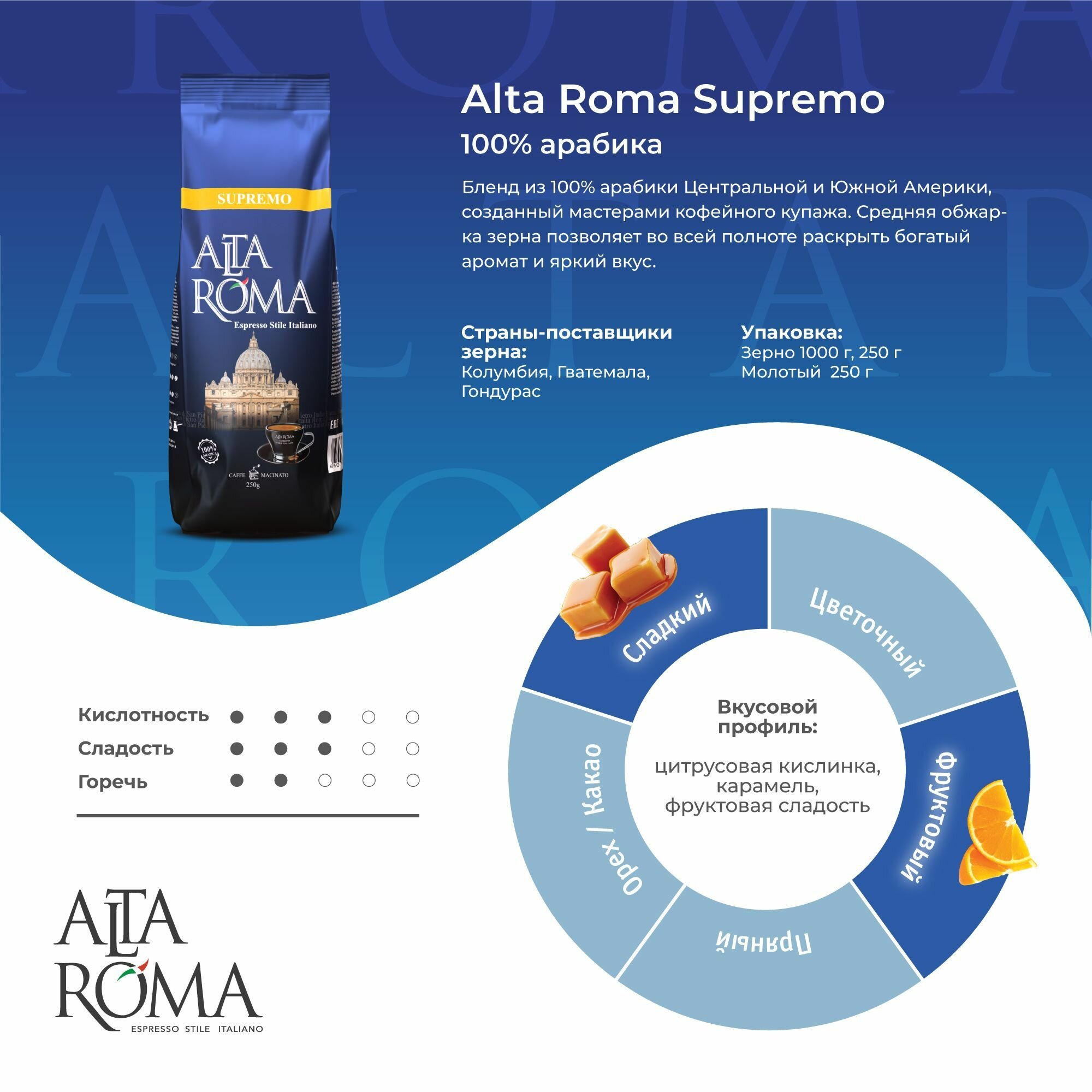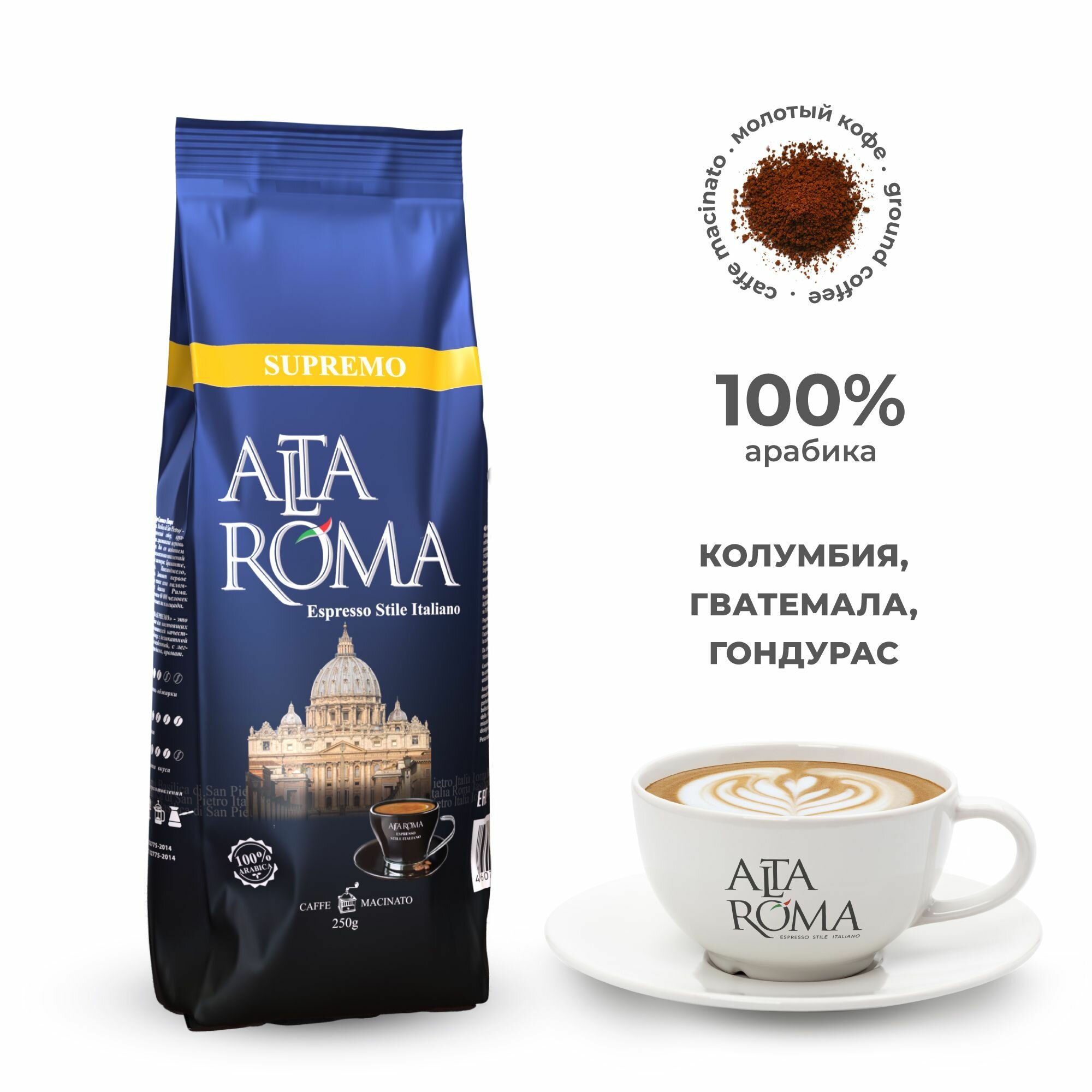 ALTA ROMA SUPREMO 250 грамм - компактный вариант молотого кофе для Вас. Зерно закупается в Италии. Соблюдая все технологические процессы транспортируется в Россию. Здесь он обжаривается и измельчается на специальном оборудовании. После расфасовывается по вакумным упаковкам и попадает к Вам.
