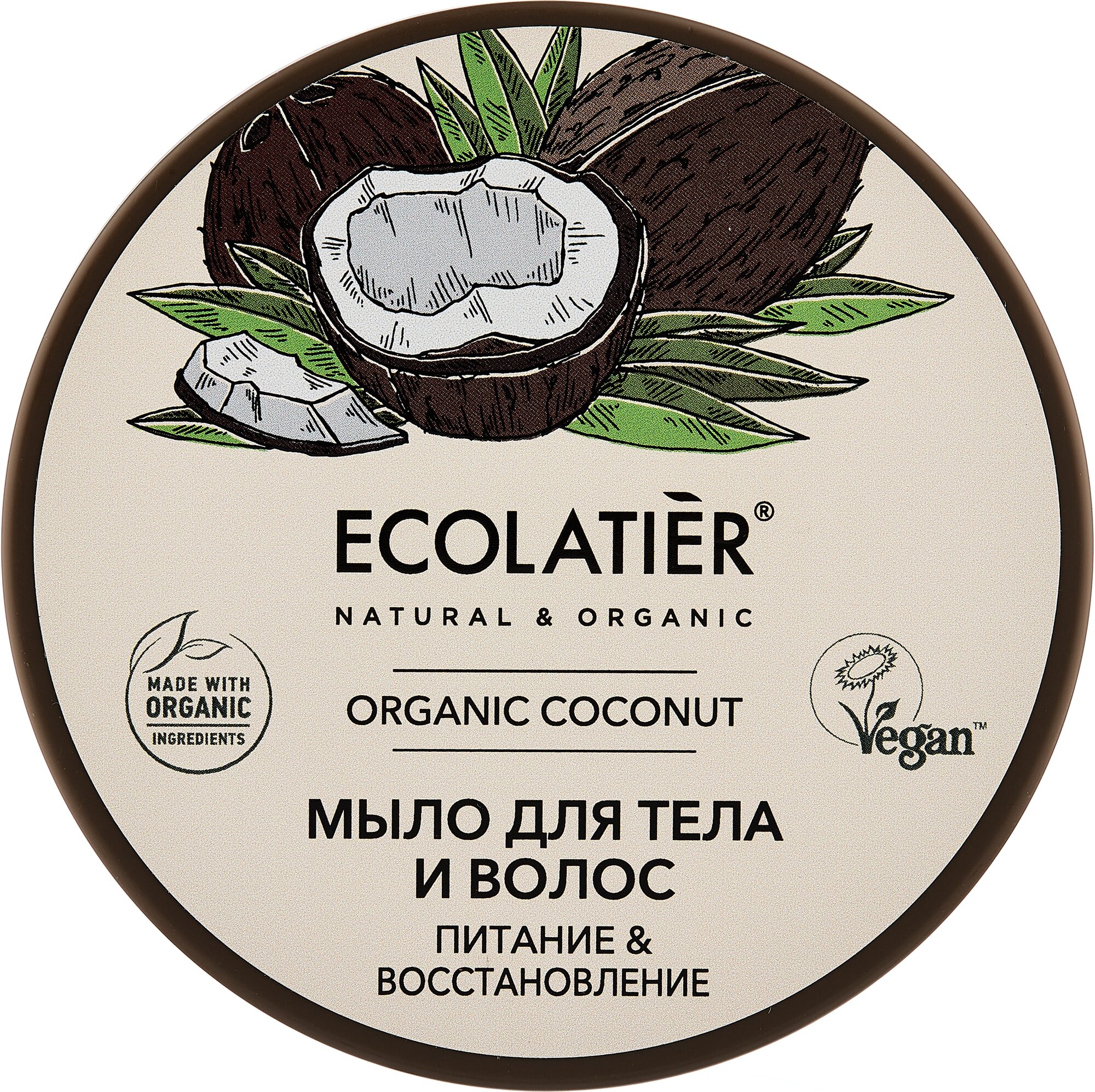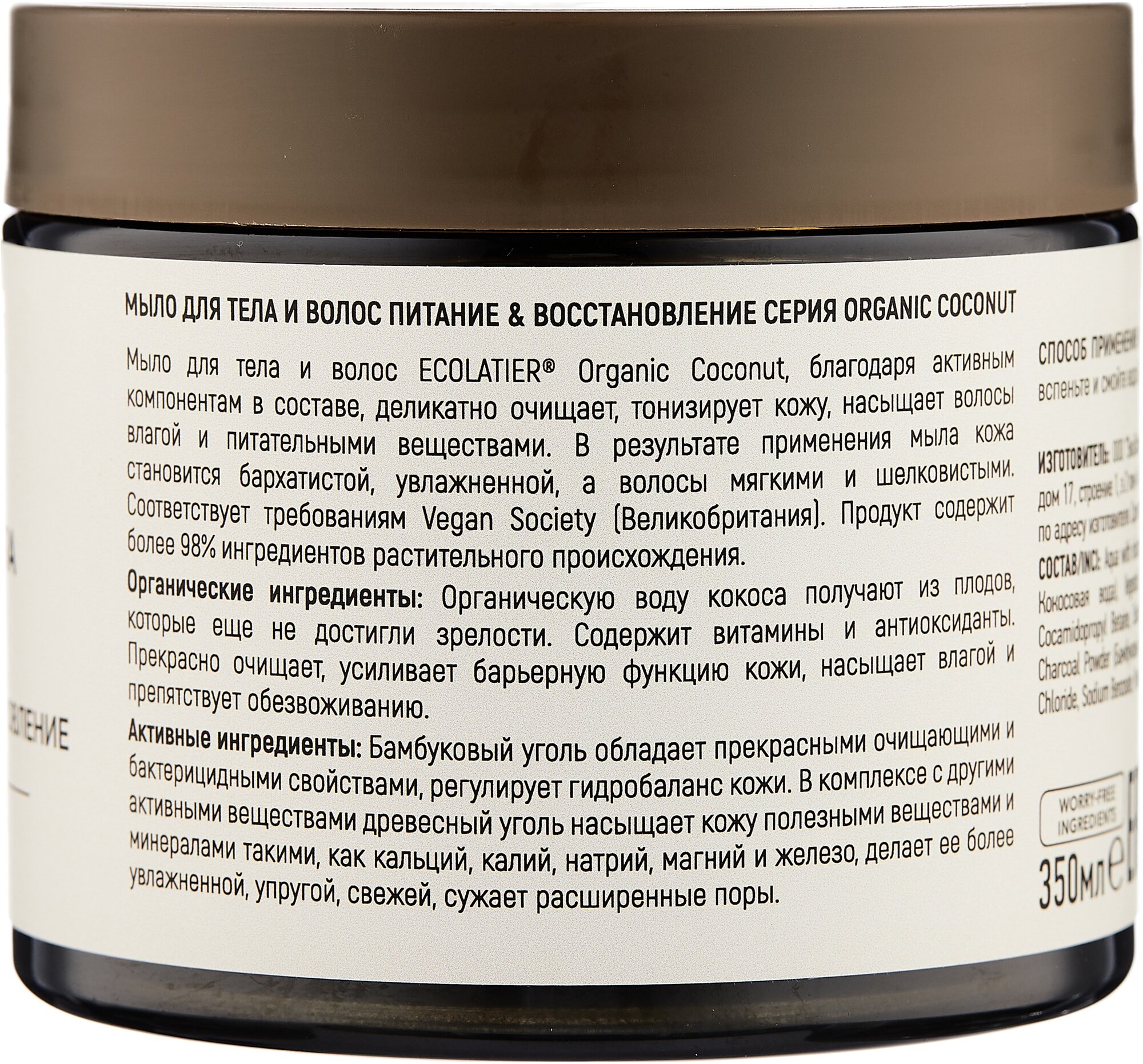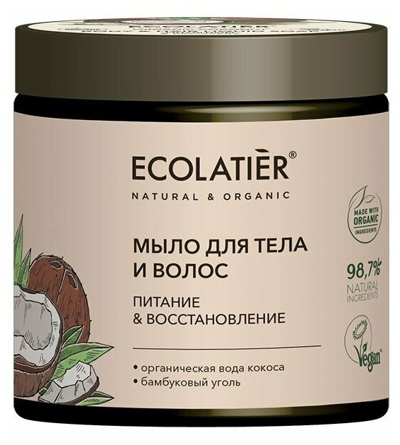 Мыло для тела и волос Питание и Восстановление Ecolatier Green 350 мл.Мыло для тела и волос ECOLATIER®, благодаря активным компонентам в составе, деликатно очищает, тонизирует кожу, насыщает волосы влагой и питательными веществами. В результате применения мыла кожа становится бархатистой, увлажненной, а волосы мягкими и шелковистыми.Соответствует требованиям Vegan Society (Великобритания).Продукт содержит более 98% ингредиентов натурального происхождения.Органические ингредиенты:Органическое масло кокоса – ценный косметический компонент, богато насыщенными жирными кислотами, витаминами группы В и минералами. Усиливает барьерную функцию кожи, препятствует обезвоживанию. Эффективно увлажняет волосы, восстанавливает секущиеся кончики, защищает от негативных воздействий окружающей среды.Результатом применения косметики с маслом кокоса является бархатистая, мягкая и гладкая кожа и блестящие волосы.