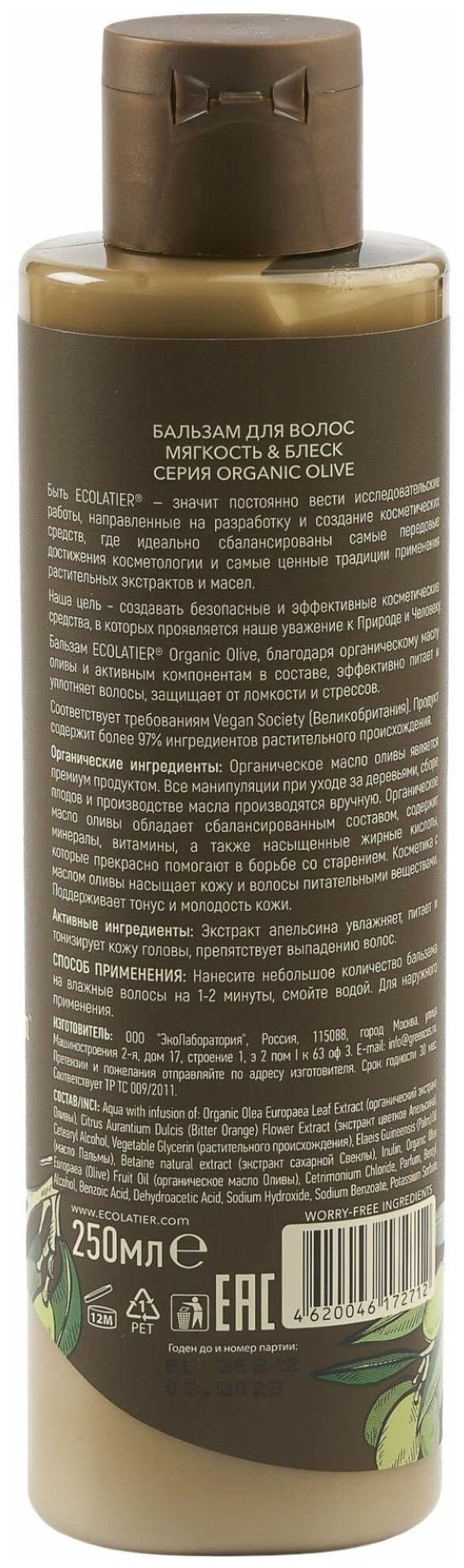 Бальзам ECOLATIER Organic Olive, благодаря органическому маслу оливы и активным компонентам в составе, эффективно питает и уплотняет волосы, защищает от ломкости и стрессов. Соответствует требованиям Vegan Society (Великобритания). Продукт содержит более 98% ингредиентов растительного происхождения. Органические ингредиенты: Органическое масло оливы является премиум продуктом. Все манипуляции при уходе за деревьями, сборе плодов и производстве масла производятся вручную. Органическое масло оливы обладает сбалансированным составом, содержит минералы, витамины, а также насыщенные жирные кислоты, которые прекрасно помогают в борьбе со старением. Косметика с маслом оливы насыщает кожу и волосы питательными веществами, содержащимися в биологически доступной форме. Поддерживает тонус и молодость кожи лица и тела. Нанесите небольшое количество бальзама на влажные волосы на 1-2 минуты, смойте водой. Для наружного применения.