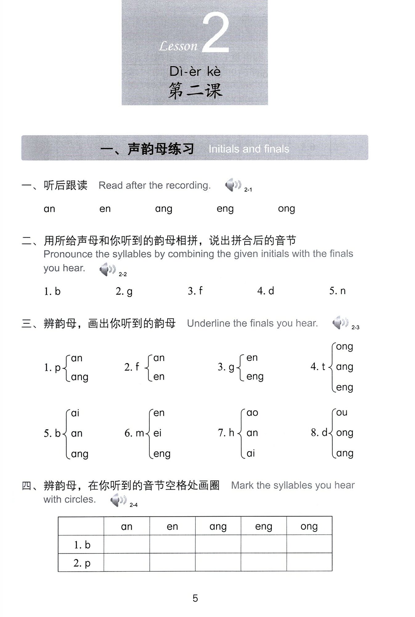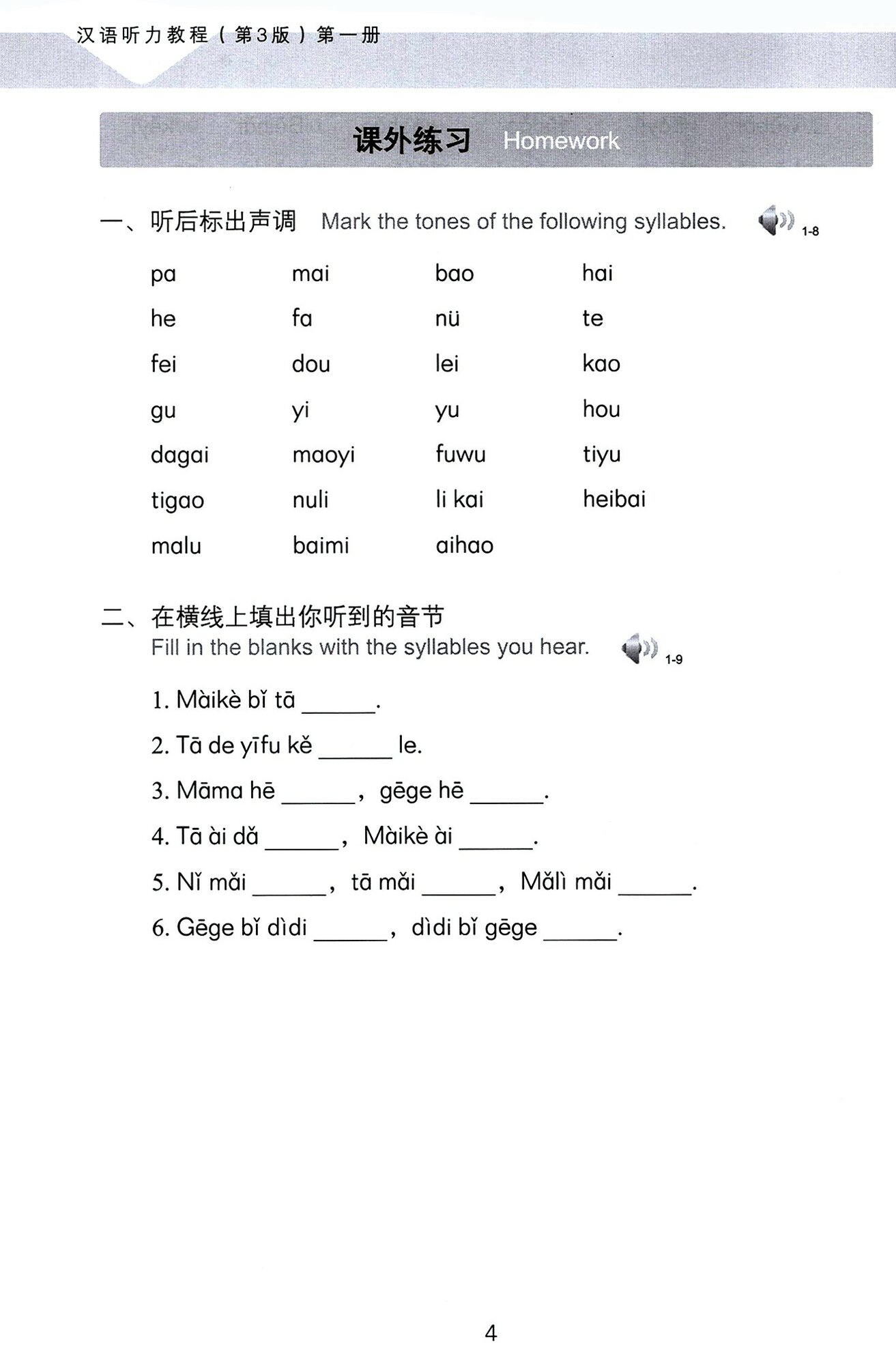 The book has 25 lessons in total, with the practice of pronunciation and intonation (initials, finals, tones, sentence stress, etc.) throughout the book to help students lay a solid foundation for listening and sound discrimination. The exercises are arranged following a progressive order: the first five lessons focus on comprehensive practice of initials, finals, tones, pronunciation and intonation; lessons 6-15 have dialogue listening comprehension in addition to the comprehensive exercises on pronunciation and intonation; lessons 16-25 move toward listening comprehension of dialogues and short passages and meanwhile further the practice of pronunciation and intonation. All the exercise items are closely related to and coordinating with the grammatical items in Chinese Course.