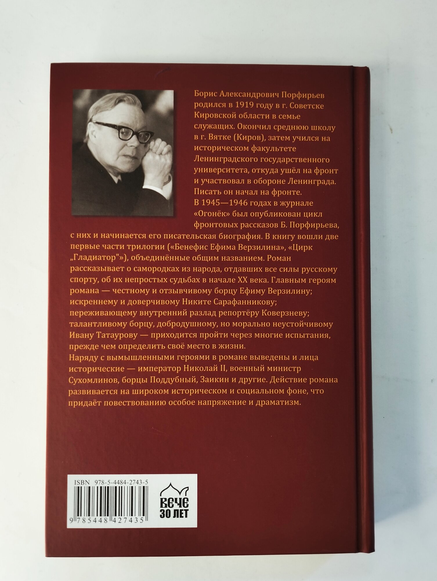 Борис Александрович Порфирьев родился в 1919 году в г. Советске Кировской области в семье служащих. Окончил среднюю школу в г. Вятке (Киров), затем учился на историческом факультете Ленинградского государственного университета, откуда ушёл на фронт и участвовал в обороне Ленинграда. Писать он начал на фронте. В 1945—1946 годах в журнале «Огонёк» был опубликован цикл фронтовых рассказов Б. Порфирьева, с них и начинается его писательская биография. В книгу вошли две первые части трилогии («Бенефис Ефима Верзилина», «Цирк „Гладиатор"»), объединённые общим названием. Роман рассказывает о самородках из народа, отдавших все силы русскому спорту, об их непростых судьбах в начале ХХ века. Главным героям романа — честному и отзывчивому борцу Ефиму Верзилину; искреннему и доверчивому Никите Сарафанникову; переживающему внутренний разлад репортёру Коверзневу; талантливому борцу, добродушному, но морально неустойчивому Ивану Татаурову — приходится пройти через многие испытания, прежде чем определить своё место в жизни. Наряду с вымышленными героями в романе выведены и лица исторические— император Николай II, военный министр Сухомлинов, борцы Поддубный, Заикин и другие. Действие романа развивается на широком историческом и социальном фоне, что придаёт повествованию особое напряжение и драматизм.