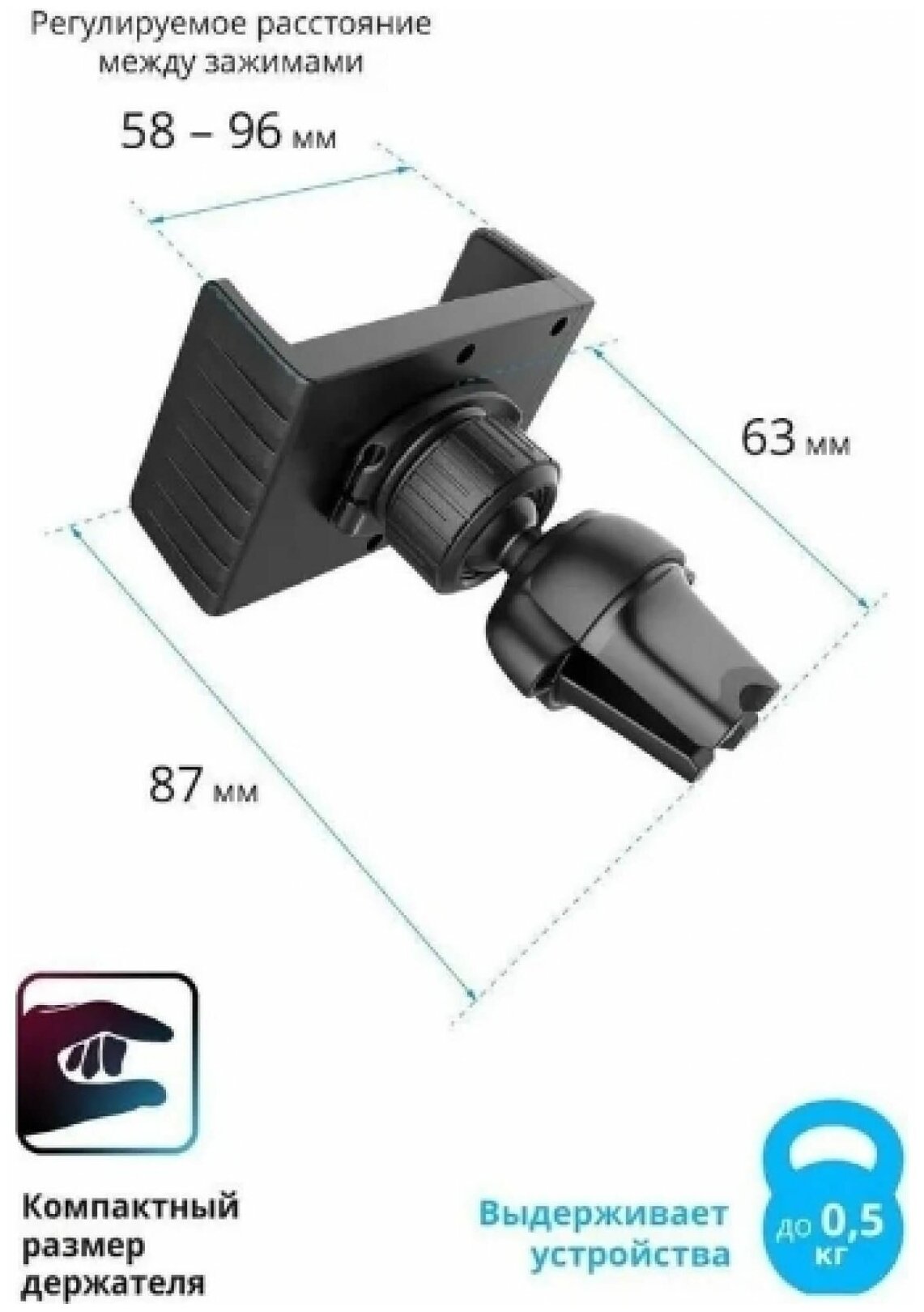 | Ширина удерживаемого устройства | от 58 до 96 мм |