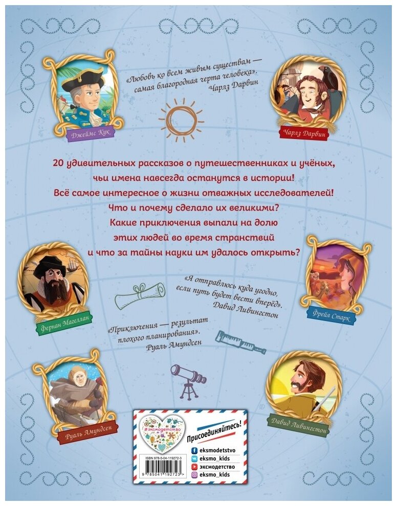 Книга включает истории про 20 исследователей из разных областей, даже про двух исследователей среди героев легенд. Очень подкупает манера повествования — каждый герой (то есть учёный или путешественник) общается с ребёнком на ‘ты’, будто бы рассказывает о своей жизни лично ему. Мне кажется, именно поэтому от историй просто невозможно оторваться. Уже третий раз перечитываем! Книга просто замечательная, яркая, красочная, познавательная, интересная. Ребенок просто не мог оторваться. Я считаю, что такие книги просто обязательно нужно купить своим детям, потому что она крайне хорошо развивают. В общем, даже мне такая книга показалась весьма занимательной.