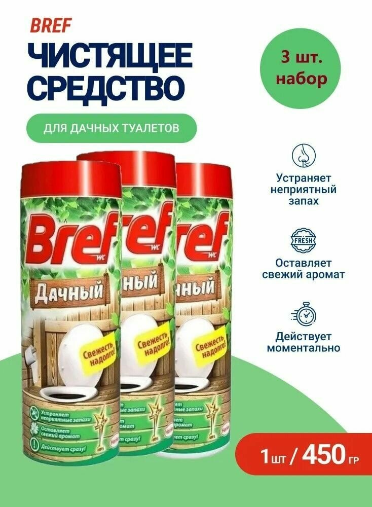 Вам нужно лишь насыпать небольшое количество средства в дачный туалет! Bref Дачный действует быстро, удаляет неприятные запахи и наполняет дачный туалет свежим ароматом.